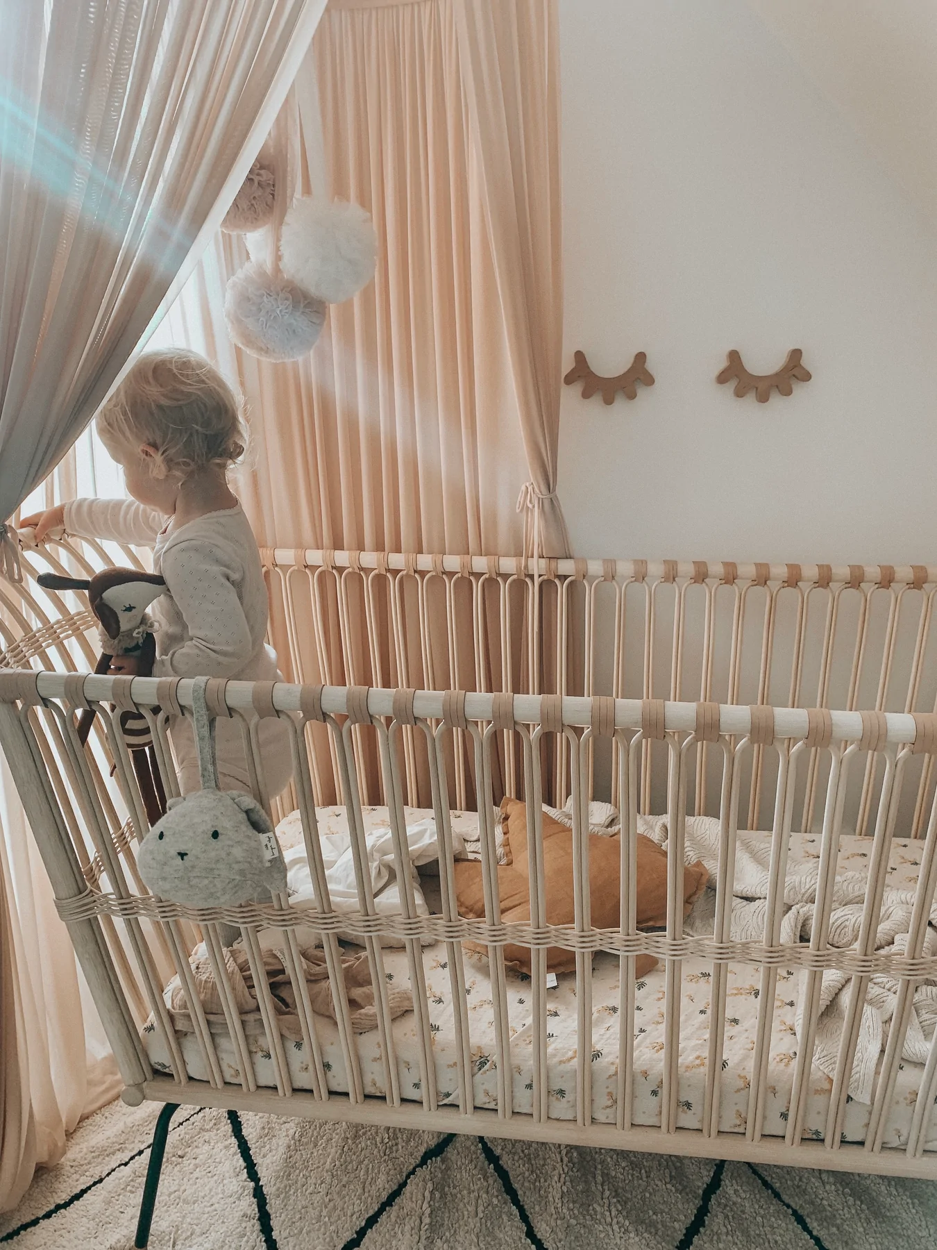 Babybett FREDERICK wirkt auf dem filigranen Metallgestell sehr leicht – beinahe schwebend. Der fein geflochtene Korb aus Rattan ist mit seinen verschiedenen Rohrdurchmessern und seinem einzigartigen Flechtmuster an Design kaum zu übertreffen. Es verleiht dem Babybett eine gewisse Transparenz. So hast du dein Baby bzw. Kind stets im Blick und dein Kind kann bereits seine Umgebung aus dem Bettchen heraus erkunden. Feine Riemchen aus pflanzlich gegerbtem Leder umschließen die einzelnen Verbindungen des Rattan-Geflechts und verleihen ihm zusätzliche Festigkeit. Die warmen natürlichen Farben von Rattan und Leder verbinden sich dabei zu einem einzigartigen Muster. Kleine Füße aus Mangoholz sorgen für eine gleichmäßige und schonende Bodenauflage.