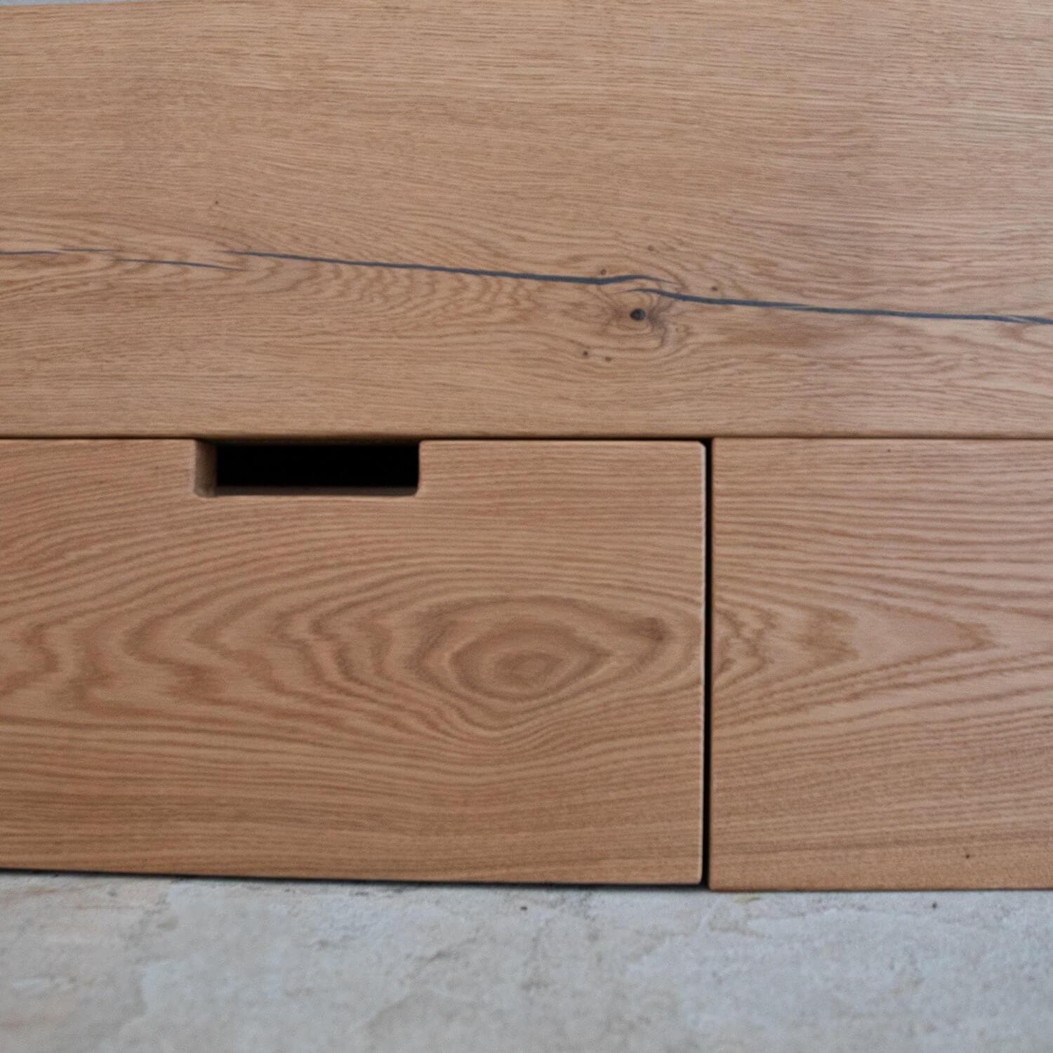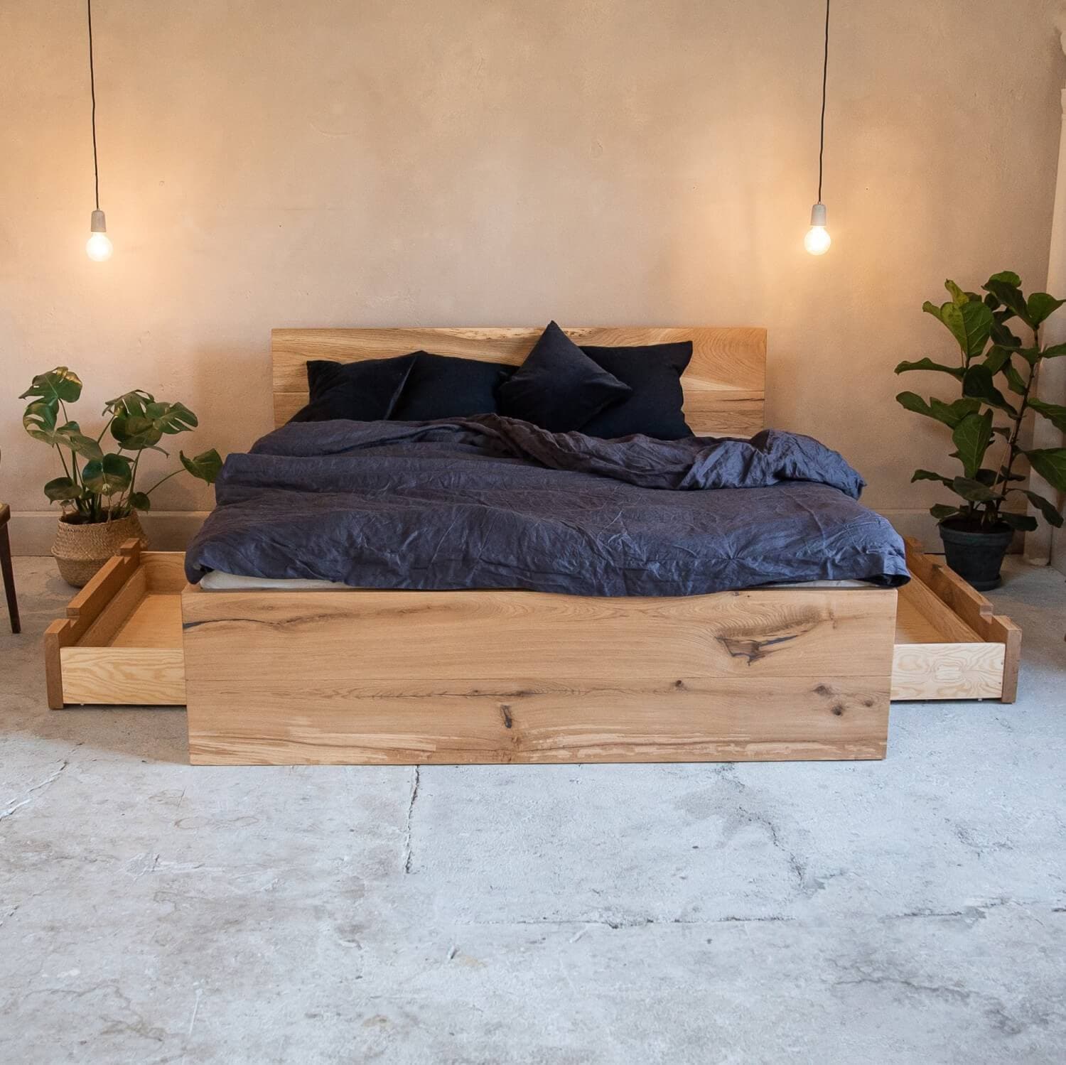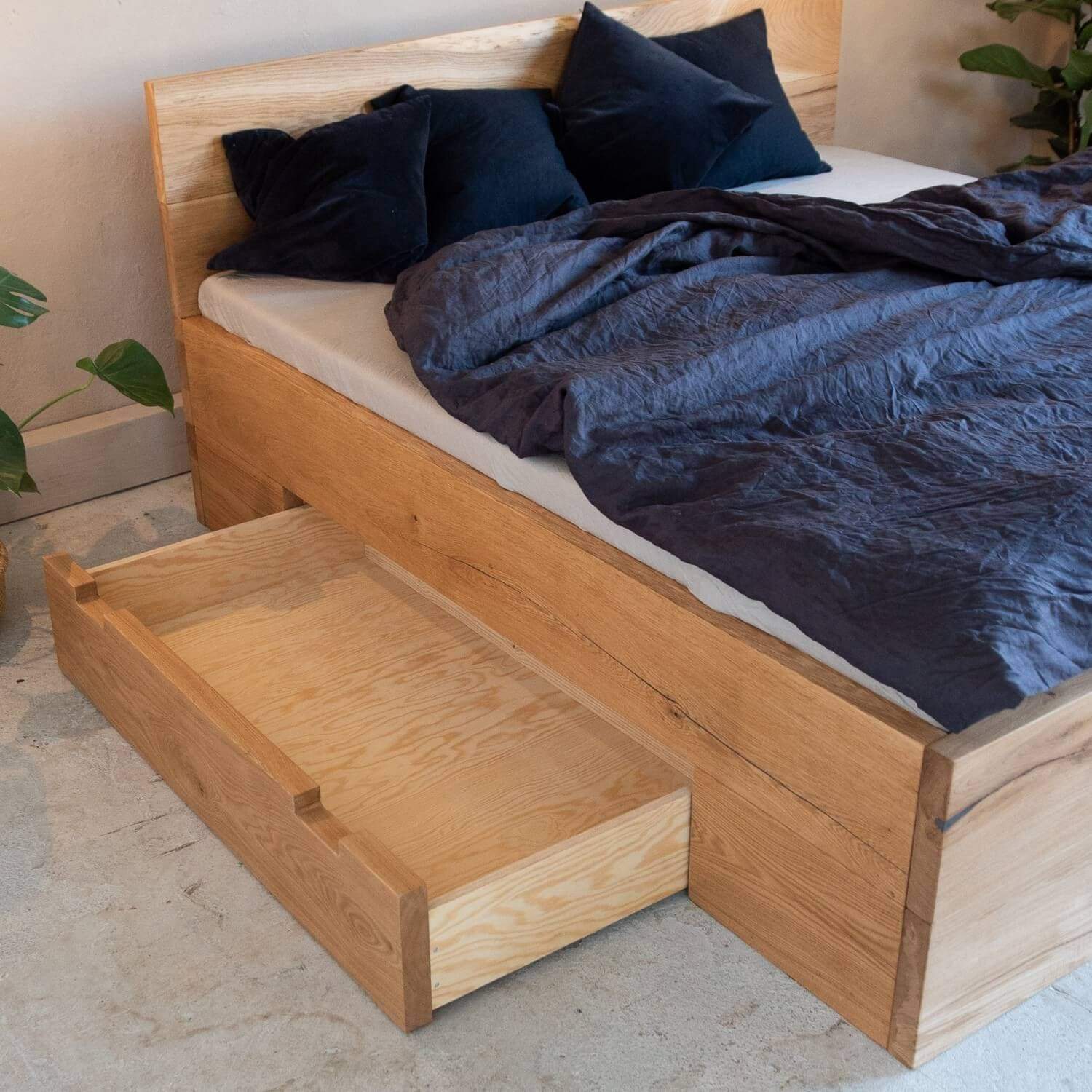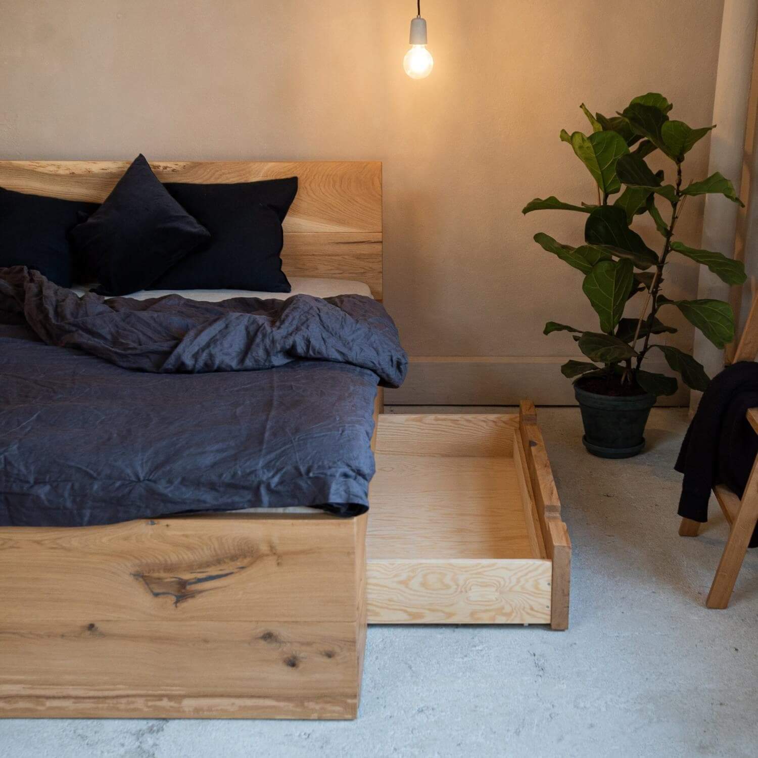 Das Bett EKRUM aus massiver Eiche ist ein echtes Platzwunder. Die Schubladen befinden sich versteckt an beiden Seiten des Bettes und laufen auf einem verstärkten Schienen-System. Die Größe der Schubladen beträgt 120 x 70 x 20 cm. Damit ist für genügend zusätzlichen Stauraum gesorgt. Der Bettrahmen hat eine Gesamthöhe von 48 cm. Er besteht aus jeweils zwei miteinander verbundenen Holzbohlen an jeder Seite, welche mit Stahlwinkeln verschraubt sind. Das Kopfteil hat eine Gesamthöhe von 96 cm. Ein an der Innenseite angebrachter Holzbalken trägt den Lattenrost und sorgt für zusätzliche Stabilität.