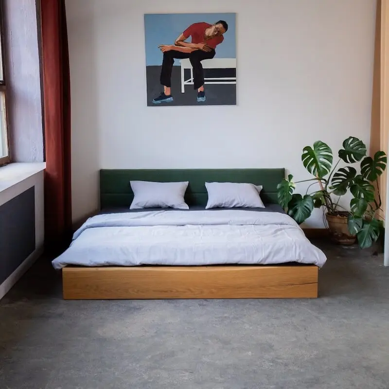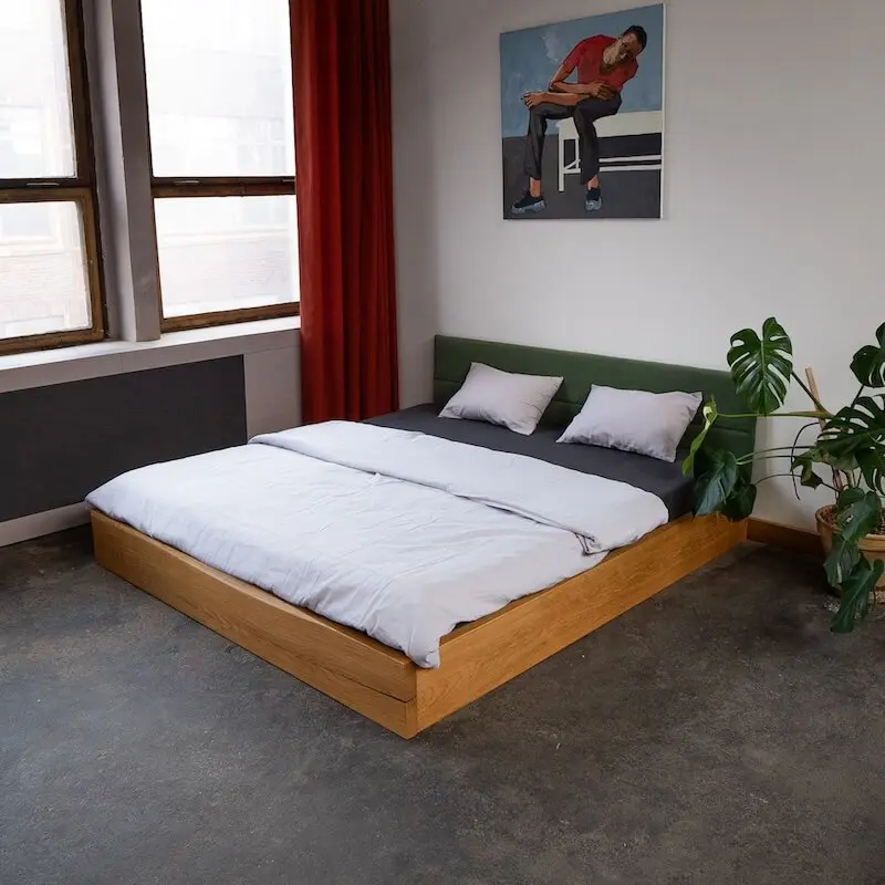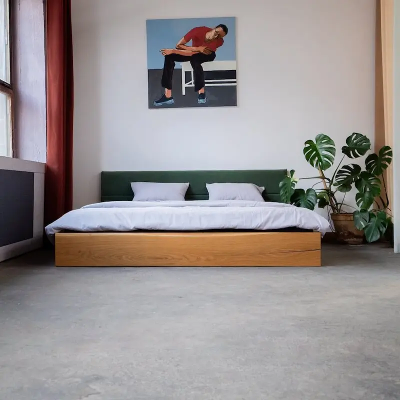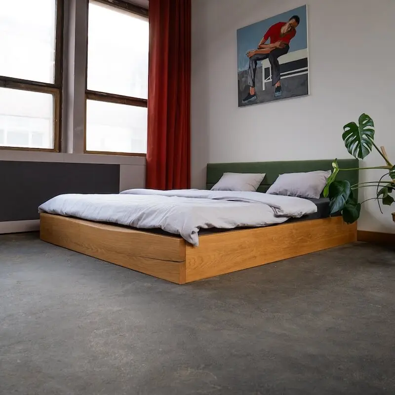 Der Bettrahmen liegt direkt auf dem Boden auf und hat eine Höhe von ca. 24 cm. Er besteht aus vier mit Stahlwinkeln verbundenen Eichenbohlen. Das Kopfteil ergänzt die Höhe ab der Bettoberkante um 48 cm. Ein an der Innenseite angebrachter Holzbalken trägt den Lattenrost und sorgt für zusätzliche Stabilität.
