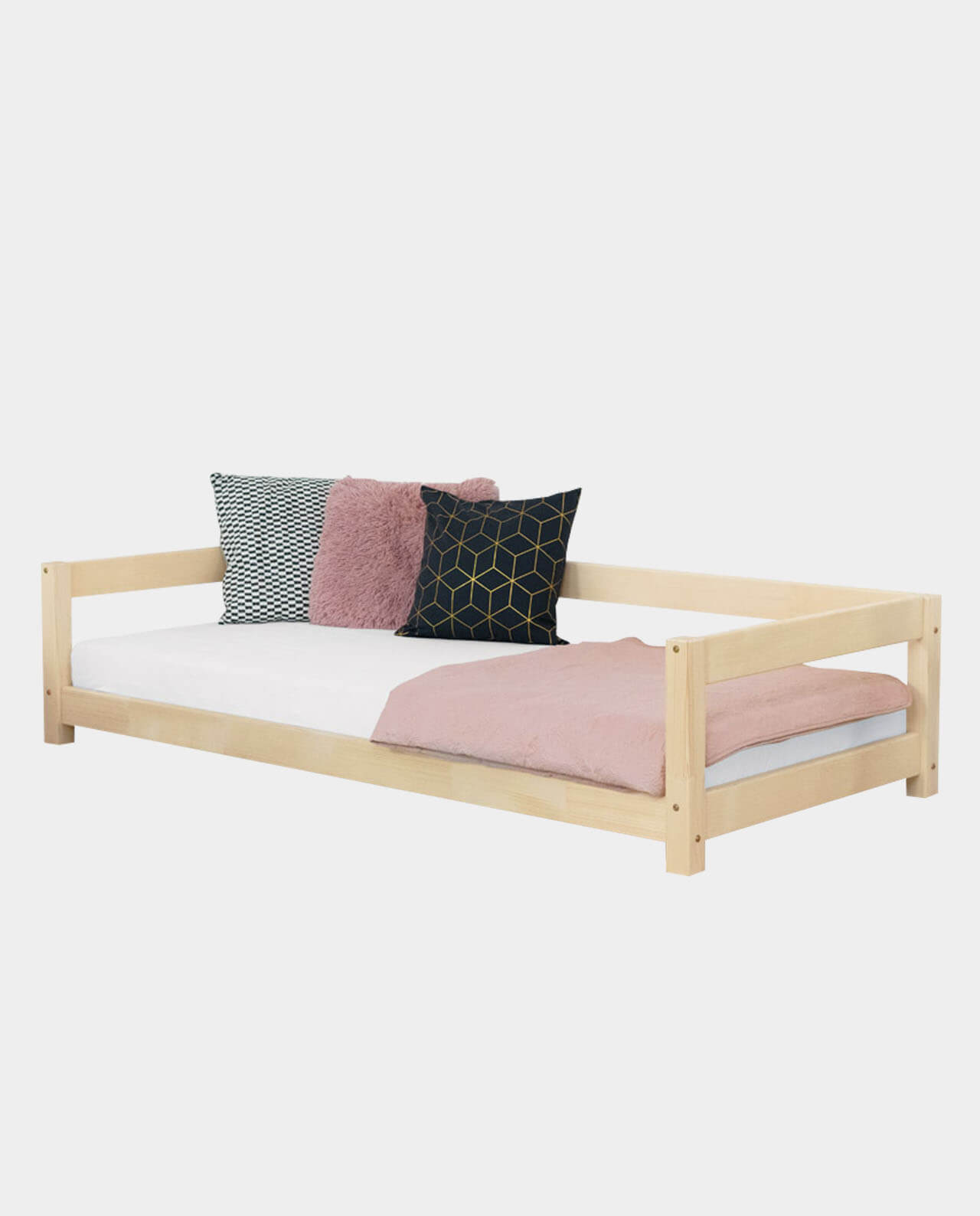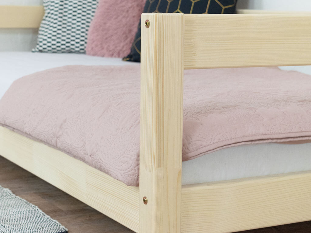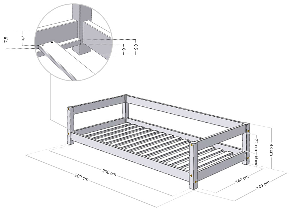 Dieses wundervolle Bett STUDY bietet alles was es braucht, um sich nachts richtig wohl zu fühlen. Das Bett ist handgefertigt aus 6 cm dickem Vierkantholz (massive Fichte). Es ist mit ökologischen Farben lackiert, die die Natur schützen und auch für Allergiker geeignet sind. Die Lackierung ist auf Wasserbasis. Daher kommt die schöne Struktur/Maserung des Holzes noch durch. Das Bett kann mit einem Gewicht bis zu 150 kg belastet werden. Der Bettrahmen befindet sich 6 cm über dem Boden. Du kannst das Bett mit den Zusatzfüßen FOOTS um 10-20 cm erhöhen, um darunter Platz zu schaffen!