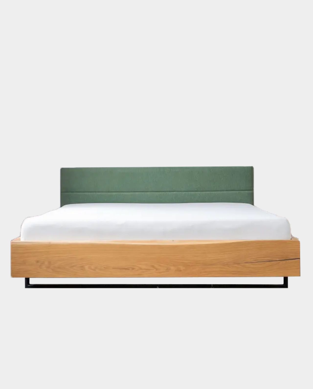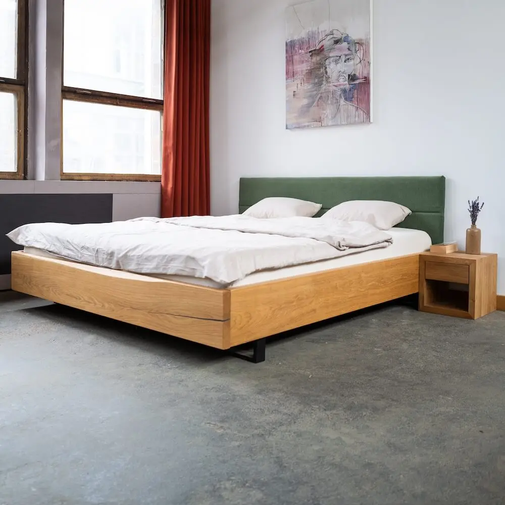 Der Bettrahmen besteht aus vier mit Stahlwinkeln verbundenen Eichenbohlen und hat eine Höhe von 36cm. Das Kopfteil weist eine Gesamthöhe von 84cm auf. Nach innen versetzte Stahlfüße verleihen dem Bett eine schwebende Optik. Der Stahlfuss hat wahlweise eine matte Rohstahloptik (transparenter Zaponlack) oder du entscheidest dich für weiße oder schwarz lackierte Stahlbeine. Ein an der Innenseite angebrachter Holzbalken, trägt den Lattenrost und sorgt für zusätzliche Stabilität. Das hochwertige Eichenholz wird mit einem natürlichen Holzwachs behandelt.