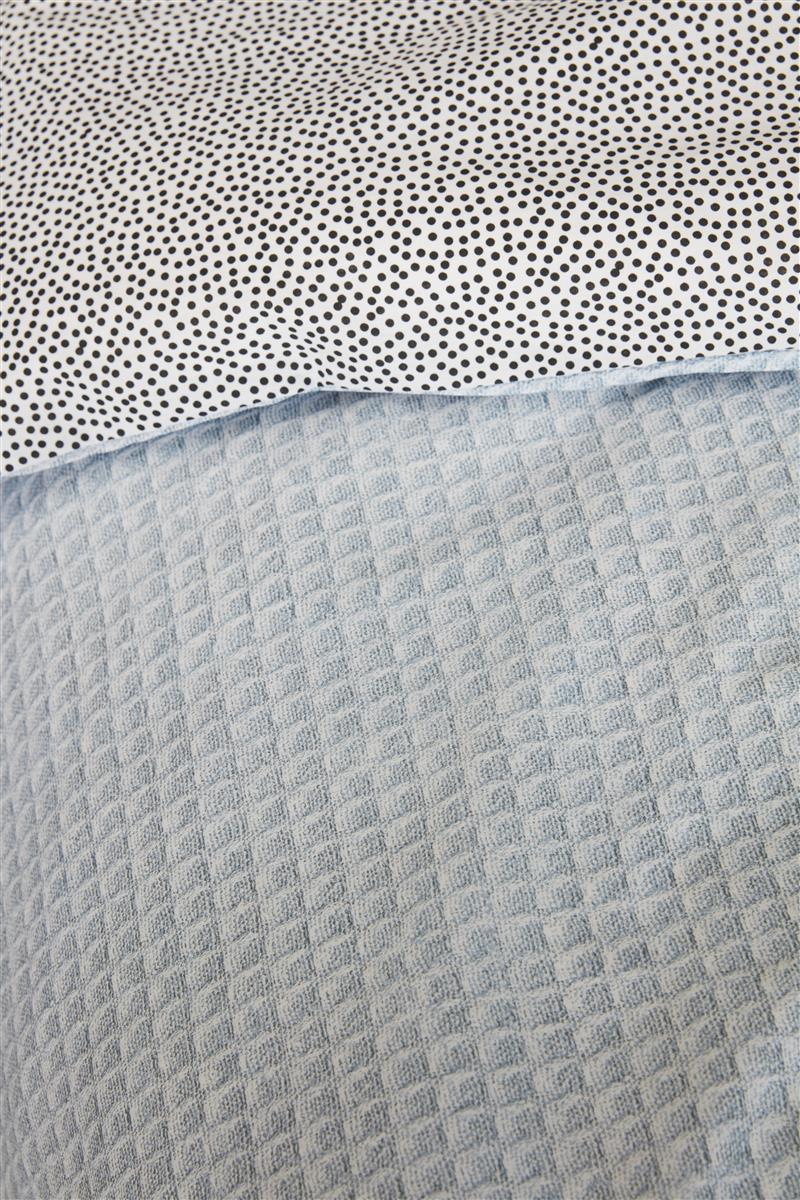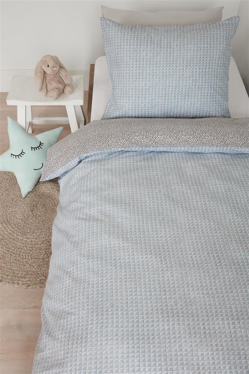 Bettwäsche KATE ist eine moderne Bettwäsche für das Kinderzimmer mit einem kleinkarierten Waffelmuster auf der Vorderseite. Die Rückseite des Bettbezugs trägt ein unregelmäßiges Punktemuster. Die Vorderseite ist in verschiedenen Blautönen gehalten, welche für eine tolle Tiefenwirkung sorgen. Die Rückseite ist weiß und schwarz. Die Bettwäsche besteht aus 100% reiner Baumwolle von höchster Qualitäten sorgt so für gesunden Schlaf. Der Bettbezug ist zudem mit einem Reißverschluss ausgestattet.