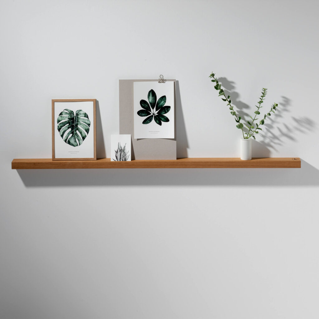 Mit der Bilderleiste OAK II lässt sich im Handumdrehen mit Bildern, Grafiken und Prints eine individuelle Galerie gestalten. Auch kleinere Erinnerungsstücke können auf der Leiste aufbewahrt werden, sodass die Bilderleiste zum schmalen Wandregal in Wohnzimmer, Küche und allen anderen Wohnbereichen wird.