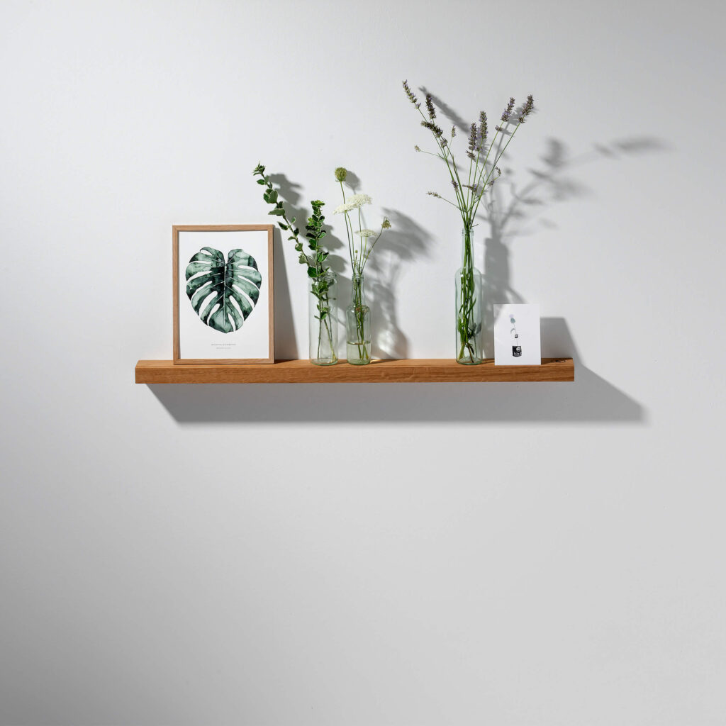 In der Bilderleiste ist der Länge nach ein Schlitz eingefräst, in dem Bilder, Postkarten und kleine Drucke Halt finden. Wird in der Fräsung ein Briefklemmer befestigt, ergeben sich weitere praktische Funktionen. So wird die Bilderleiste OAK II zur dekorativen und gleichermaßen praktischen Ablage im Wohnzimmer, der Küche und allen anderen Wohnbereichen.