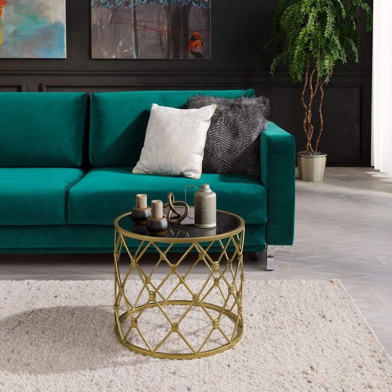 Der kleine Couchtisch ARCUM überzeugt durch sein wunderschönes luxuriöses Design. Er wertet optisch jeden Raum auf. Der Tisch wird in aufwändiger und liebevoller Handarbeit geschmiedet. Er besticht durch eine hohe Qualität und eine hochwertige Verarbeitung. Der schicke Couchtisch steht beispielhaft für die hohe Kunst des Schmiedens. Die Tischplatte aus schwarzem Glas passt hervorragend zu dem goldenen Stahlgestell.