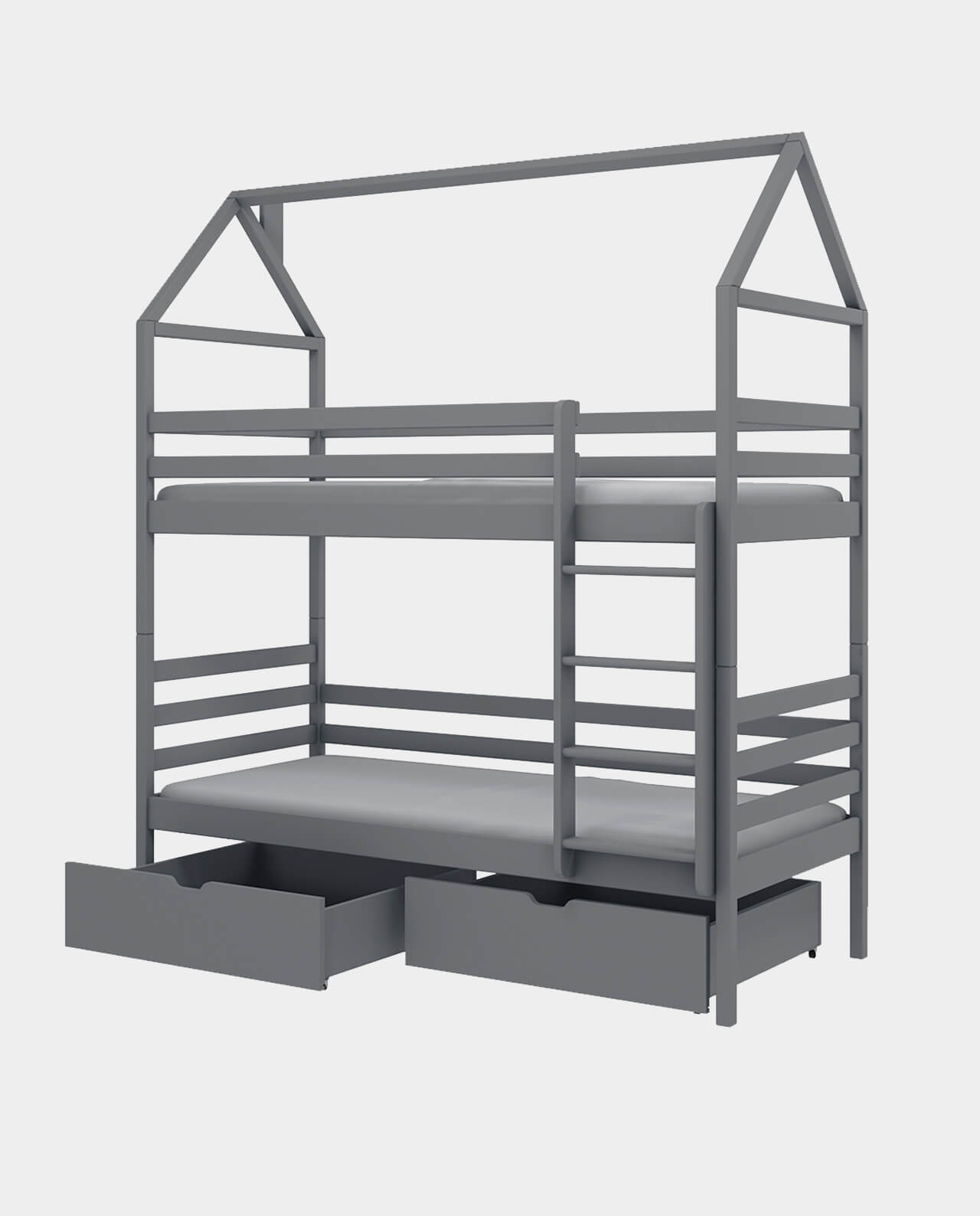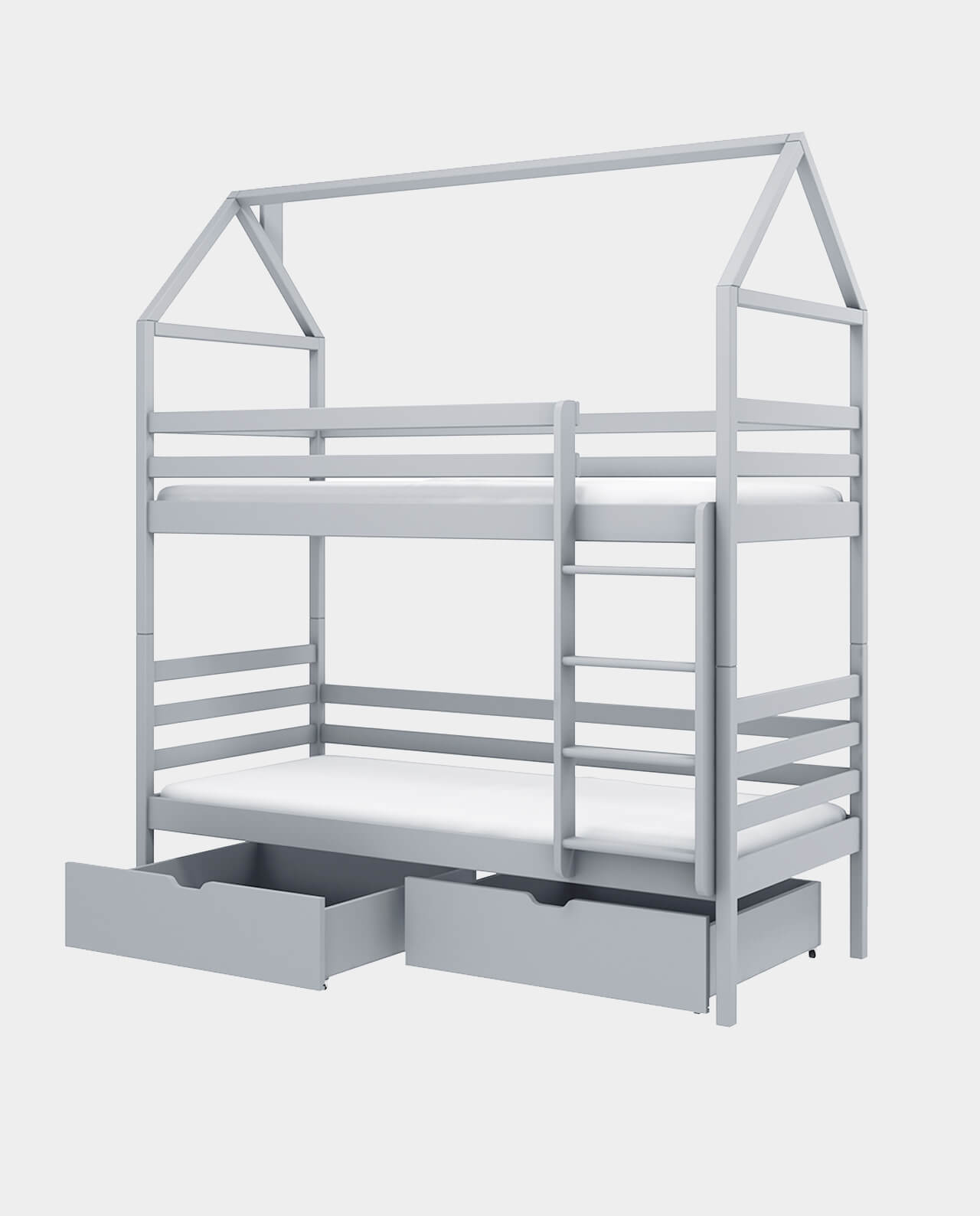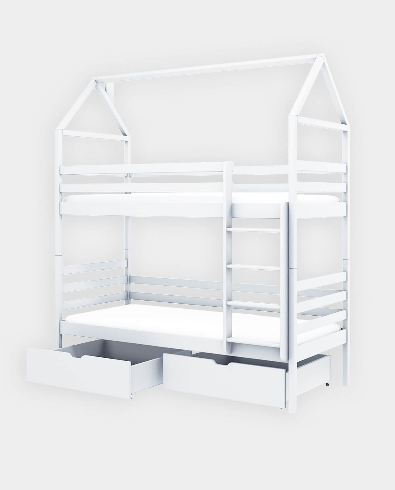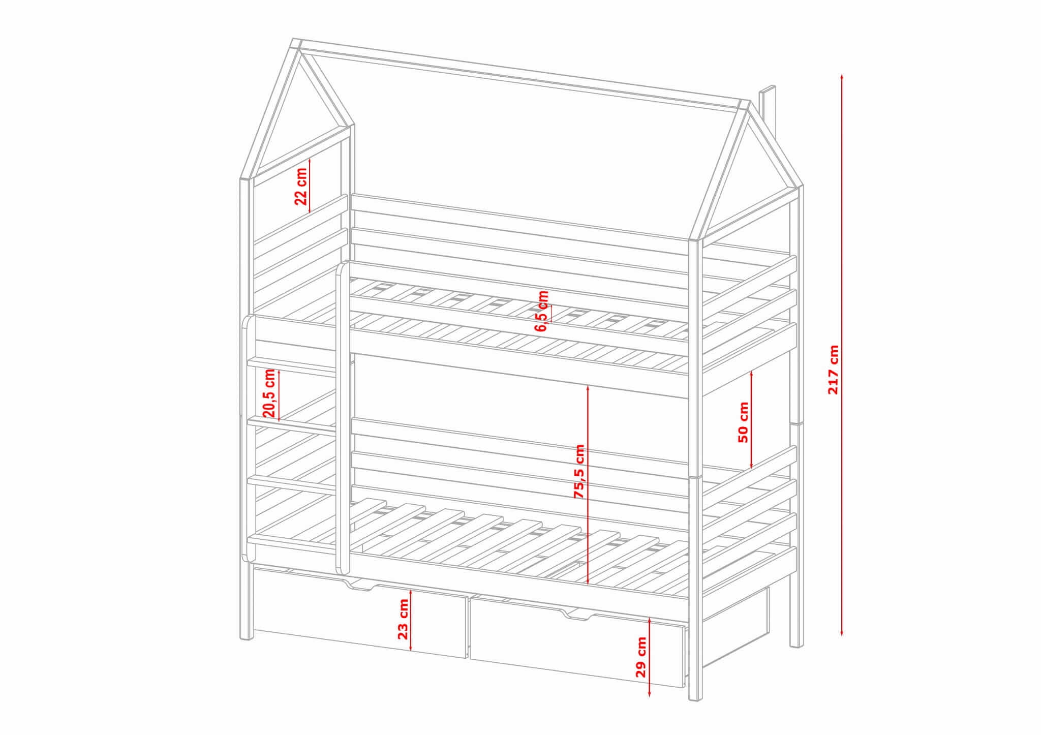 Das Etagenbett ALEX in der Größe 90×200 cm wird aus massiver Kiefer aus nachhaltiger Waldwirtschaft (FSC-zertifiziert) gefertigt. Das Kinderbett wird inklusive zwei Schubladen geliefert. Diese bieten zusätzlichen Stauraum unter dem Etagenbett. Das Bett wird gemäß der Norm EN-747-1: 2012 + A1: 2015 gefertigt, wodurch das Produkt den höchsten Sicherheitsstandards entspricht. Die Leiter kann sowohl auf der linken als auch auf der rechten Seite an der Bettfront angebracht werden. Die Leiter kommt mit breiten Sprossen, die für ein bequemes Auf- und Absteigen sorgen. Die Farben (Lackierungen) sind auf Wasserbasis gemäß EN 71-3: 2019 und frei von Schadstoffen. Zwei Lattenroste sind bereits inklusive. Eine Matratze ist nicht inklusive. Dekorationen sind nicht Teil der Lieferung. Das Bett kann in zwei einzelne Kinderbetten umgebaut werden. So wird die Lebensdauer dieses Bettes verlängert und trägt zu einer nachhaltigeren Nutzung bei.
