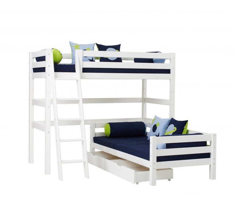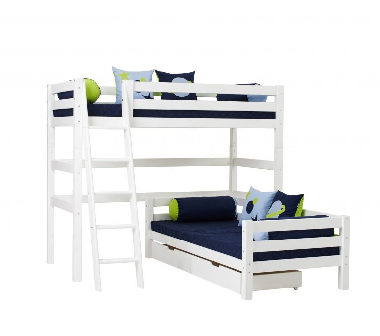 Das ECO LUXURY Etagenbett mit Winkel in den Größen 90×200 cm mit schräger Leiter ist ein Kinderbett für Zwei. Es wird aus massiver nordischer Kiefer gefertigt und ist mit dem Nordischen Umweltzeichen ausgezeichnet. Die Höhe unter dem unteren Bett beträgt 20cm. Der Abstand vom Boden bis zum Hochbett beträgt 135cm. Die Leiter kann sowohl auf der linken als auch an der rechten Frontseite des Bettes angebracht werden. Die Leiter hat Rillen und tiefe Stufen. Dadurch hat das Kind beim Aufstieg einen besseren Halt. ECO LUXURY ist ein flexibles und langlebiges Etagenbett mit höchstem Komfort und größtmöglichem Augenmerk auf die Sicherheit. Dazu kommt die Stabilität und die lange Haltbarkeit sowie die breite Palette an Modulen und Zubehör. Das Bett ist modular umbaubar und kann beispielsweise in zwei einzelne Kinderbetten verwandelt werden. So wächst das Bett mit den Anforderungen und Bedürfnissen des Kindes. Das Hochbett kann auch unabhängig vom Juniorbett gestellt werden. Lattenroste sind bereits in der Lieferung inklusive. Matratzen sind nicht inklusive. Dekorationen sind nicht Teil der Lieferung.