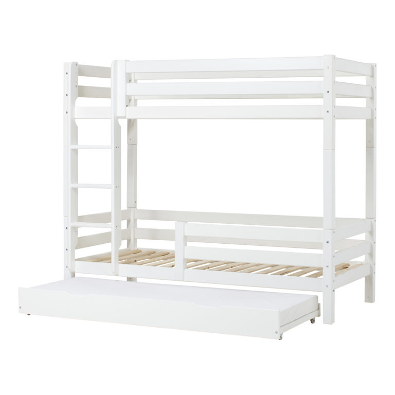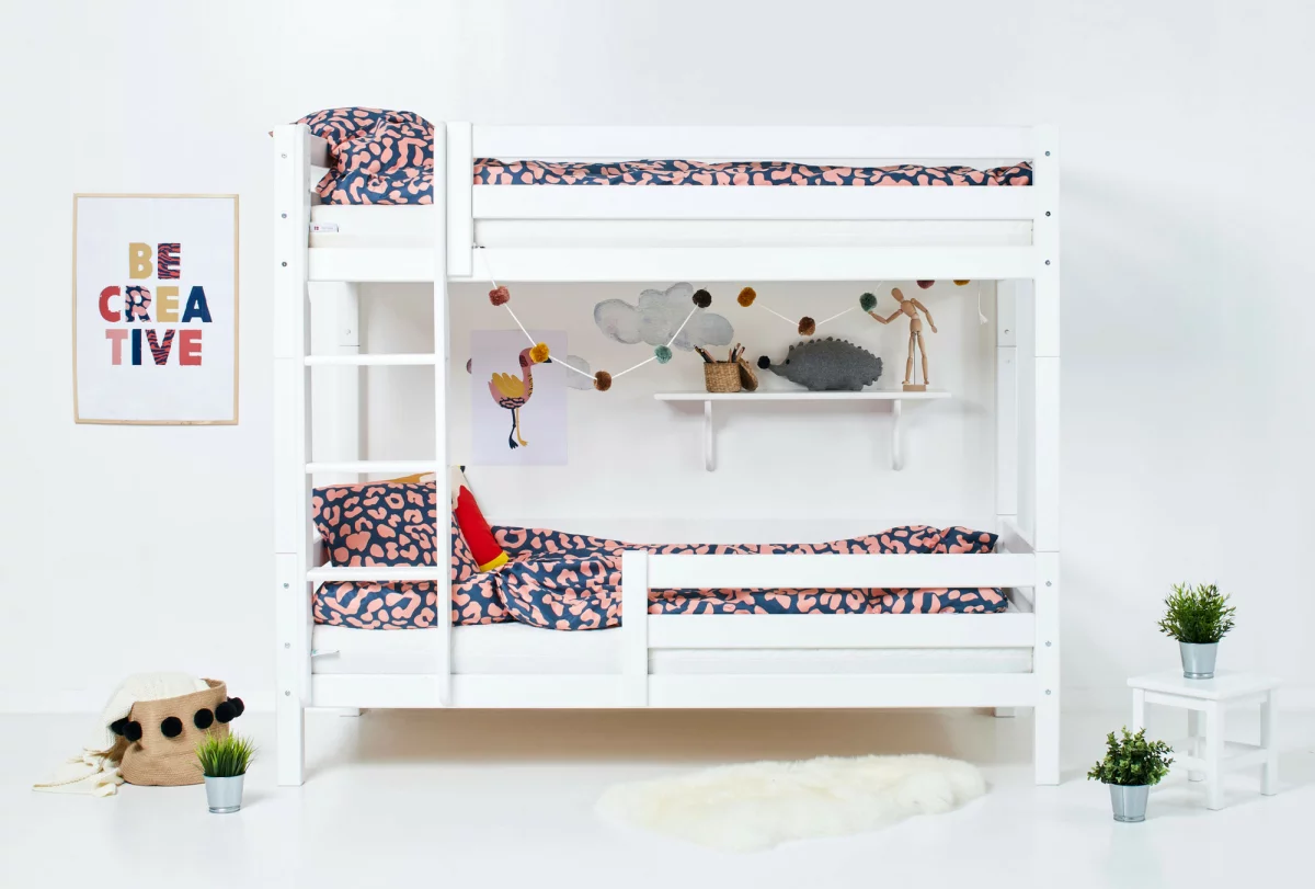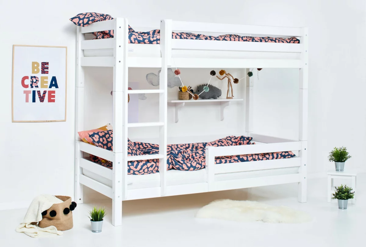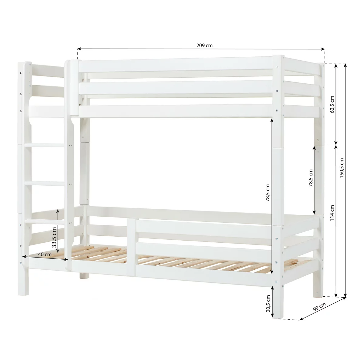 Das HOPPEKIDS ECO LUXURY Etagenbett mit Rückwand und Rausfallschutz in den Größen 90×200 cm oder 120×200 cm mit gerader Leiter ist ein Kinderbett für Zwei. Es wird aus massiver nordischer Kiefer gefertigt und ist mit dem Nordischen Umweltzeichen ausgezeichnet. Die Höhe unter dem Bett beträgt 20cm. Der Abstand zwischen dem unteren Bett und dem oberen Bett beträgt 78,5 cm (bei Gesamthöhe 150cm) und 134,5 cm (bei Gesamthöhe 177cm). Die Leiter kann sowohl auf der linken als auch an der rechten Frontseite des Bettes angebracht werden. HOPPEKIDS ECO LUXURY ist ein flexibles und langlebiges Etagenbett mit höchstem Komfort und größtmöglichem Augenmerk auf die Sicherheit. Dazu kommt die Stabilität und die lange Haltbarkeit sowie die breite Palette an Modulen und Zubehör. Das Bett ist modular umbaubar und kann beispielsweise in zwei einzelne Kinderbetten verwandelt werden. So wächst das Bett mit den Anforderungen und Bedürfnissen des Kindes verlängern den Lebenszyklus des Produktes. Der Rausfallschutz kann jederzeit abmontiert werden. Lattenroste sind bereits in der Lieferung inklusive. Matratzen sind nicht inklusive. Das Etagenbett ist wahlweise mit zwei Schubladen oder mit Ausziehbett für die Matratzengröße 90×200 cm erhältlich. Dekorationen sind nicht Teil der Lieferung.