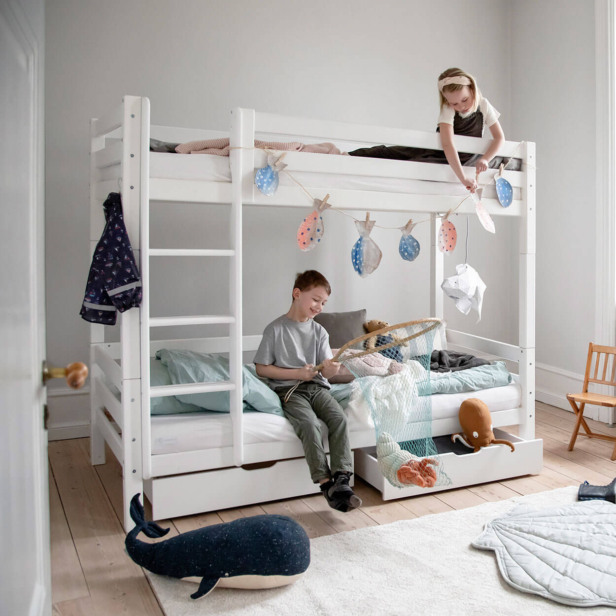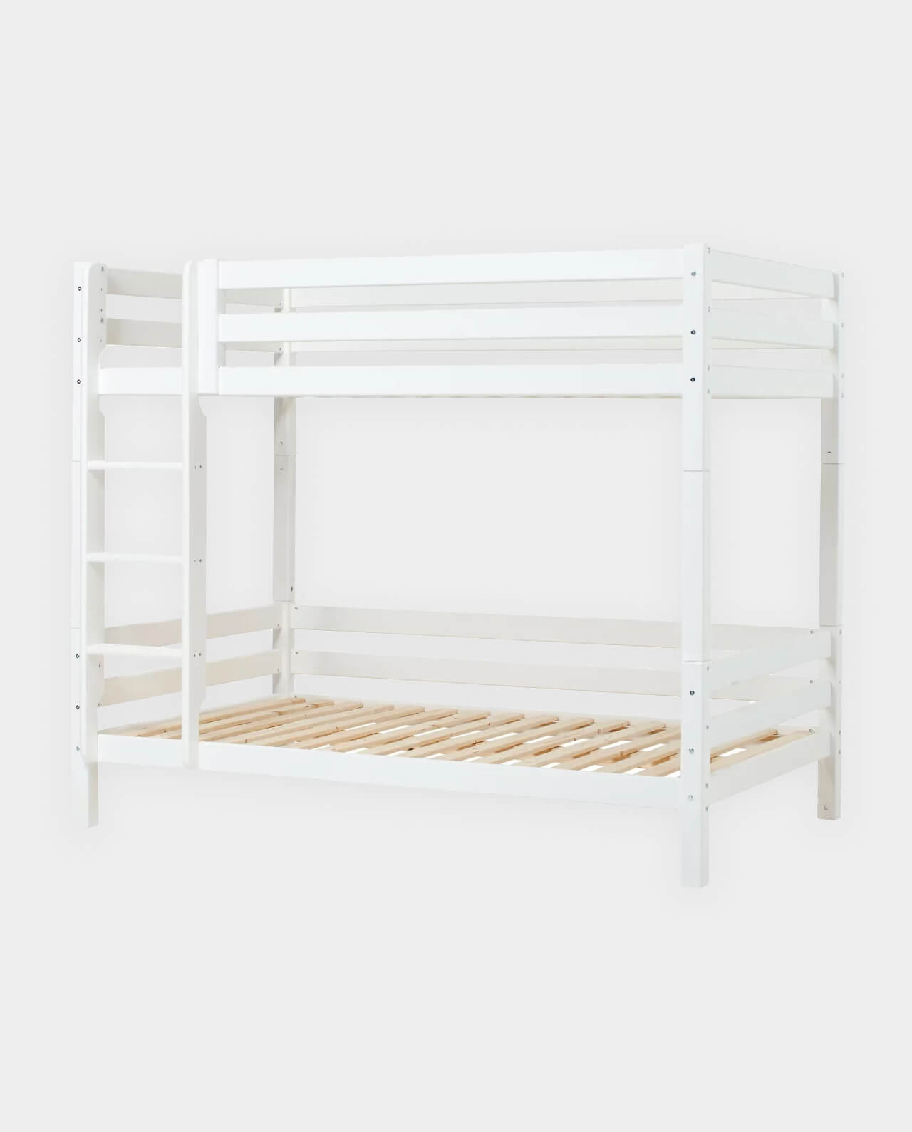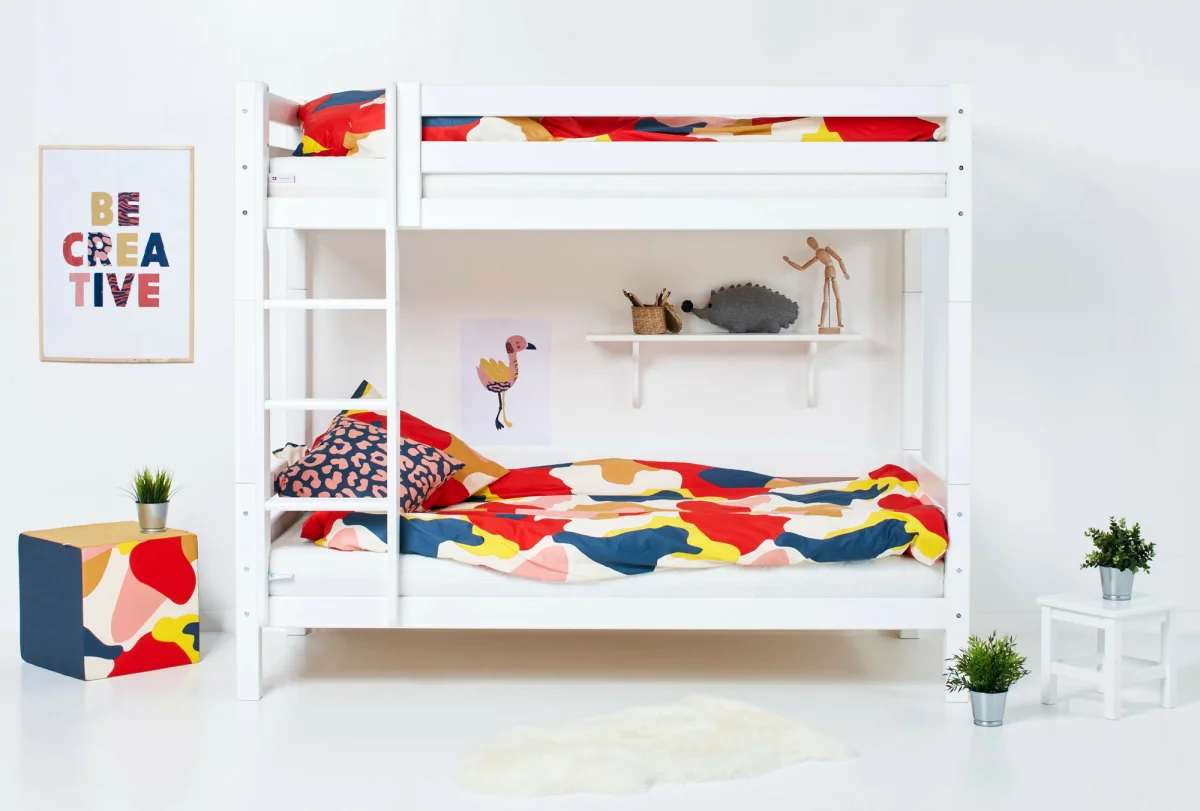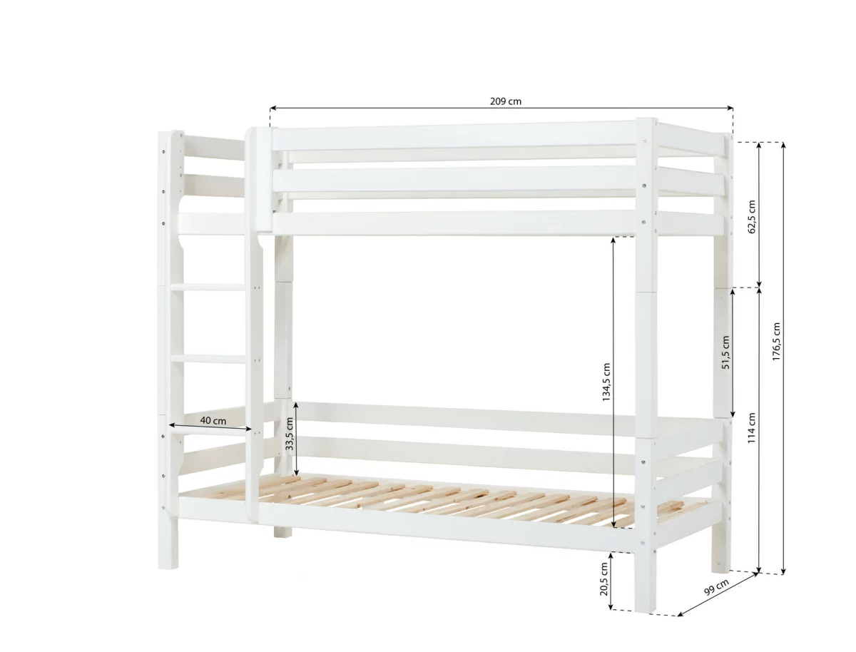 Das HOPPEKIDS ECO LUXURY Etagenbett mit Rückwand in den Größen 90×200 cm oder 120×200 cm mit gerader Leiter ist ein Kinderbett für Zwei. Es wird aus massiver nordischer Kiefer gefertigt und ist mit dem Nordischen Umweltzeichen ausgezeichnet. Die Höhe unter dem Bett beträgt 20cm. Der Abstand zwischen dem unteren Bett und dem oberen Bett beträgt 78,5 cm (bei Gesamthöhe 150cm) und 134,5 cm (bei Gesamthöhe 177cm). Die Leiter kann sowohl auf der linken als auch an der rechten Frontseite des Bettes angebracht werden. HOPPEKIDS ECO LUXURY ist ein flexibles und langlebiges Etagenbett mit höchstem Komfort und größtmöglichem Augenmerk auf die Sicherheit. Dazu kommt die Stabilität und die lange Haltbarkeit sowie die breite Palette an Modulen und Zubehör. Das Bett ist modular umbaubar und kann beispielsweise in zwei einzelne Kinderbetten verwandelt werden. So wächst das Bett mit den Anforderungen und Bedürfnissen des Kindes verlängern den Lebenszyklus des Produktes. Lattenroste sind bereits in der Lieferung inklusive. Matratzen sind nicht inklusive. Das Etagenbett ist wahlweise mit zwei Schubladen oder mit Ausziehbett für die Matratzengröße 90×200 cm erhältlich. Dekorationen sind nicht Teil der Lieferung.