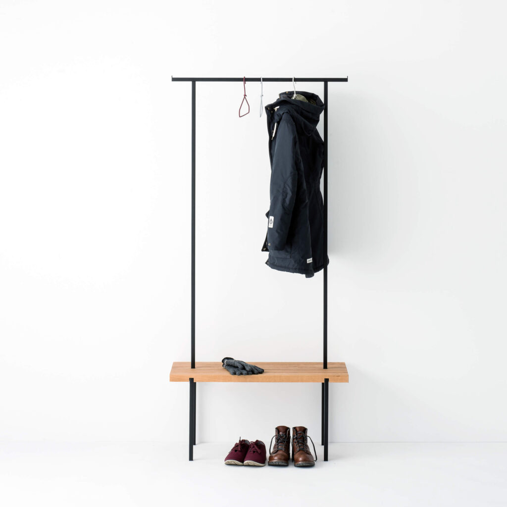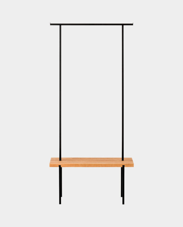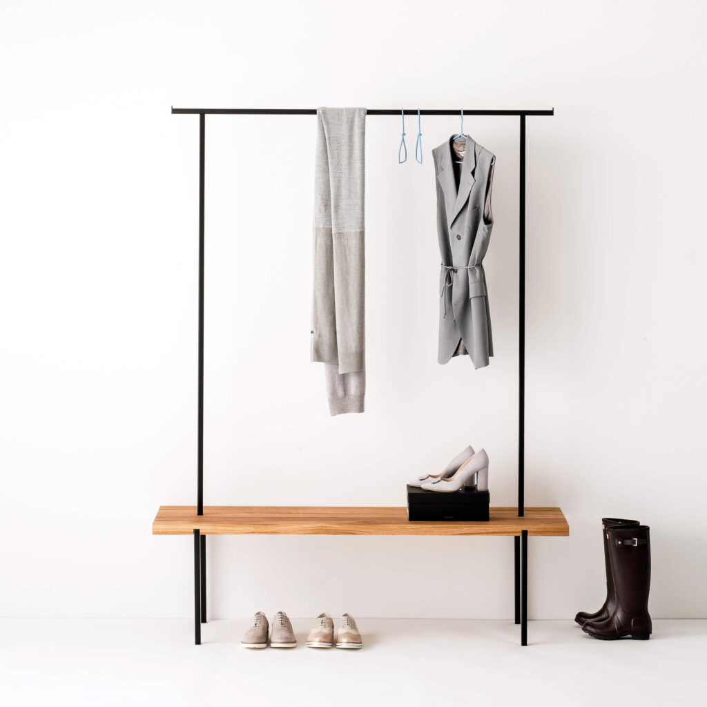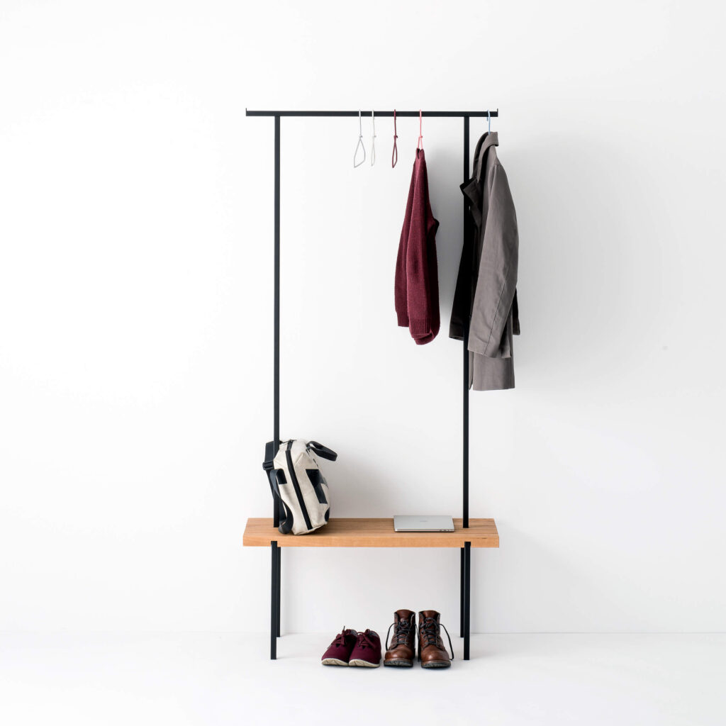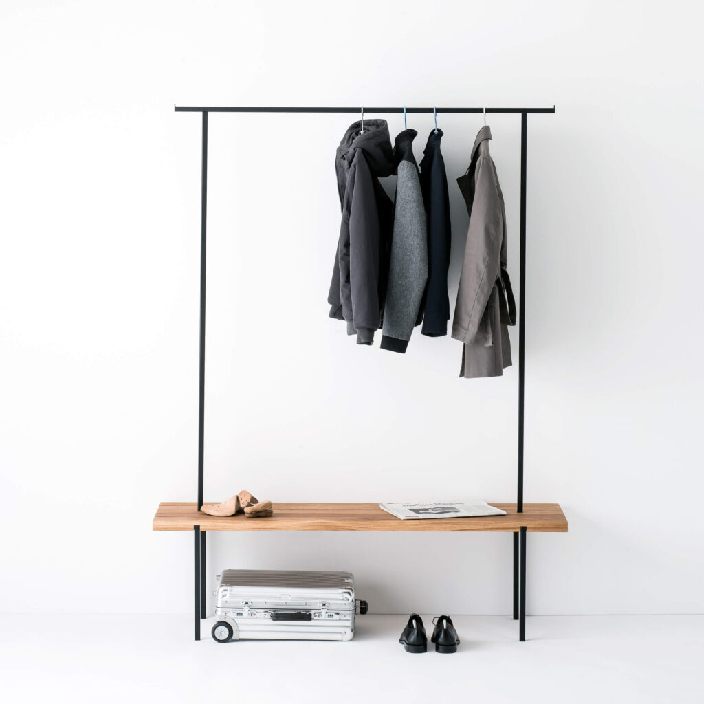 Die Garderobe mit einer Sitzfläche aus massiver Eiche ist ein Akzent und Ordnungshelfer im Flur, Ankleide- oder Schlafzimmer. Sie bietet Platz zum Hinsetzen, um bequem Schuhe zu binden und Stellfläche für Taschen. Ausreichend Hängemöglichkeit für Jacken, Mänteln und Kleidung gibt das handgeschweißte Gestänge.