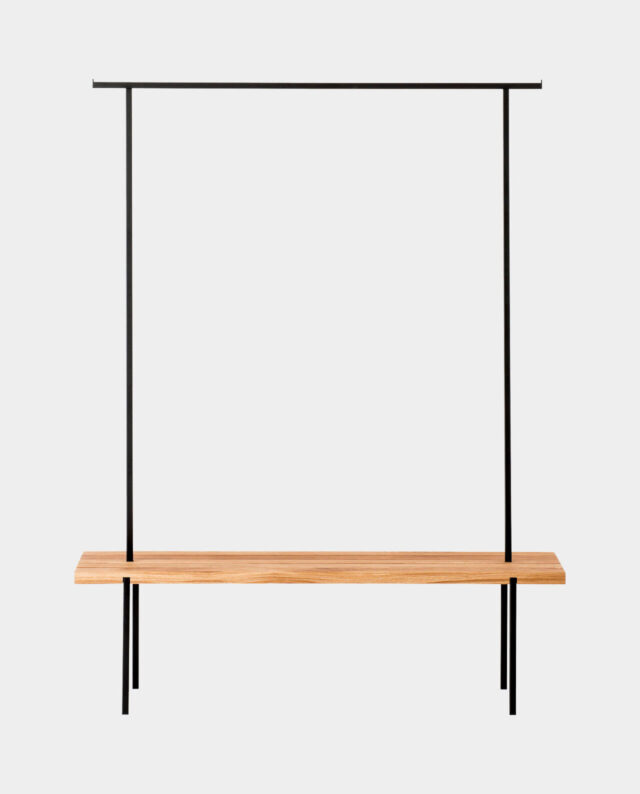 Die Garderobe mit einer Sitzfläche aus massiver Eiche ist ein Akzent und Ordnungshelfer im Flur, Ankleide- oder Schlafzimmer. Sie bietet Platz zum Hinsetzen, um bequem Schuhe zu binden und Stellfläche für Taschen. Ausreichend Hängemöglichkeit für Jacken, Mänteln und Kleidung gibt das handgeschweißte Gestänge.