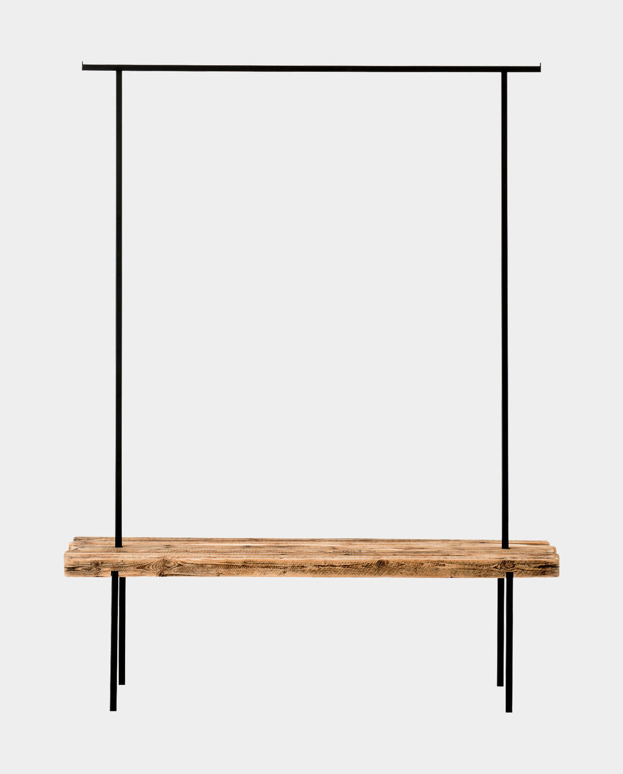Das Gestänge ist aus robustem pulverbeschichtetem Metall gefertigt, die Sitzfläche aus rustikalem Altholz.