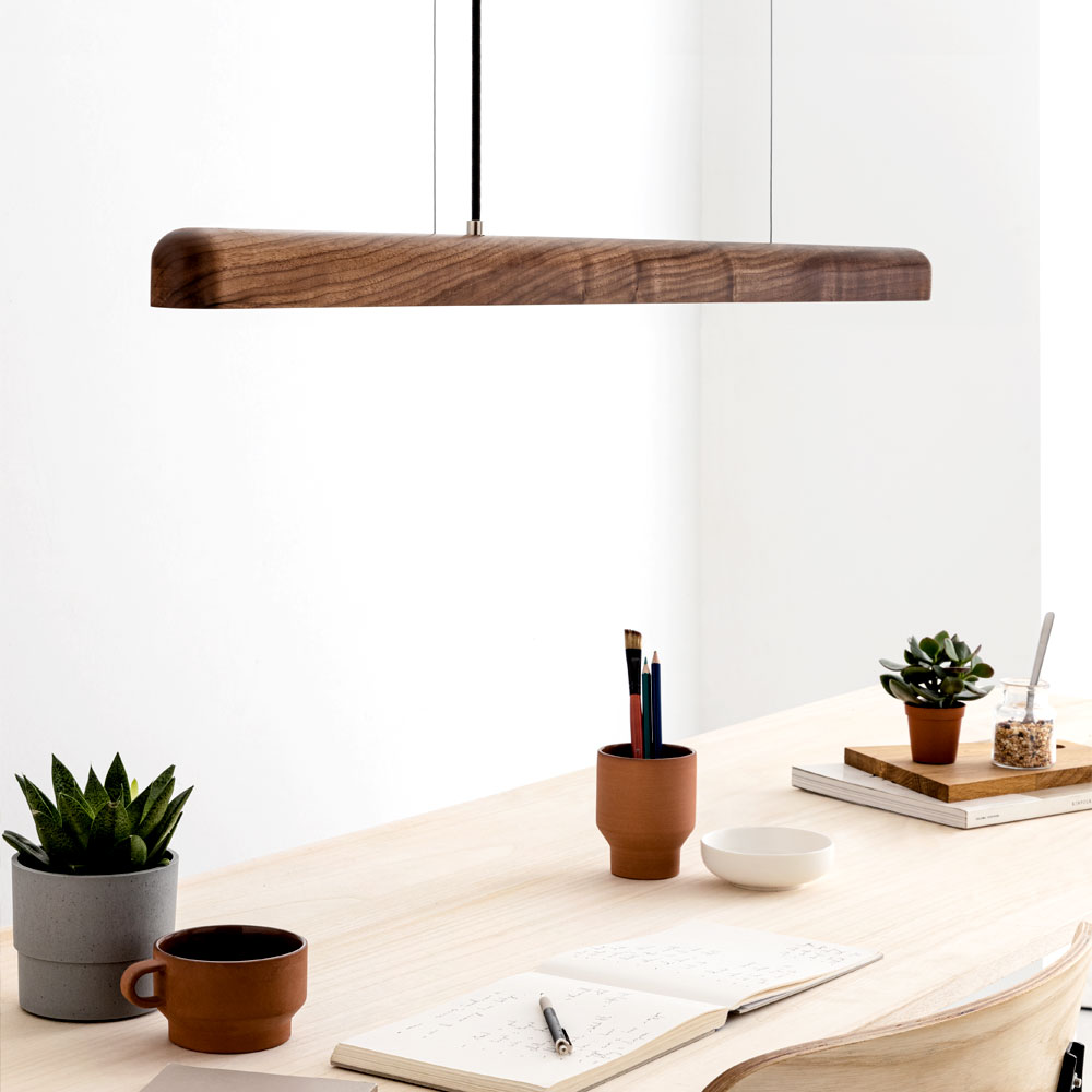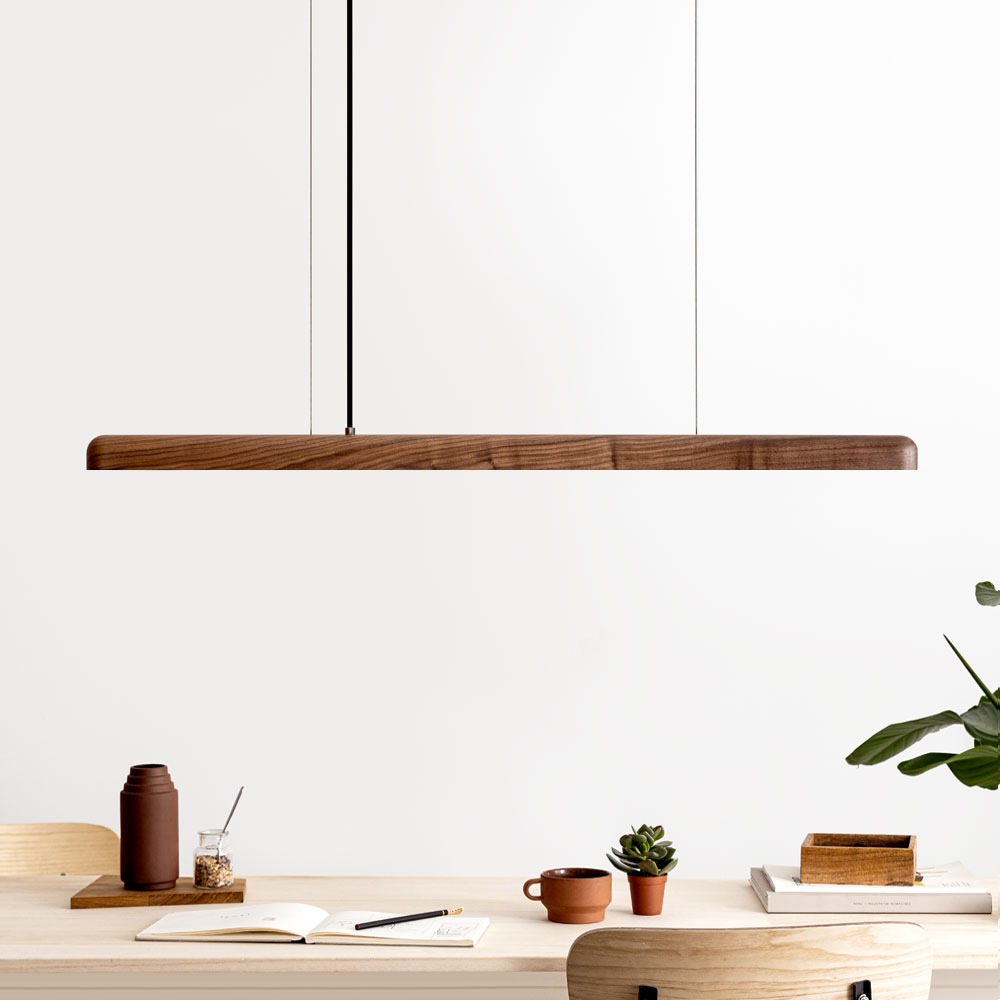 Hängelampe NYX ist eine LED Pendelleuchte aus Holz. Sie verbindet hochwertige LED-Technik und feines Handwerk in einem minimalistischen Design. Trotz der schlanken Form ist die LED-Technik in die Leuchte integriert. Ein „Kasten“ an der Decke entfällt, und lediglich ein schlichter Baldachin versteckt die Anschlüsse an der Decke.