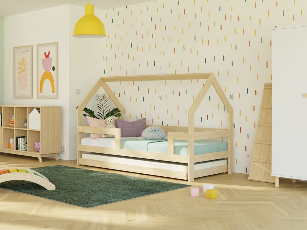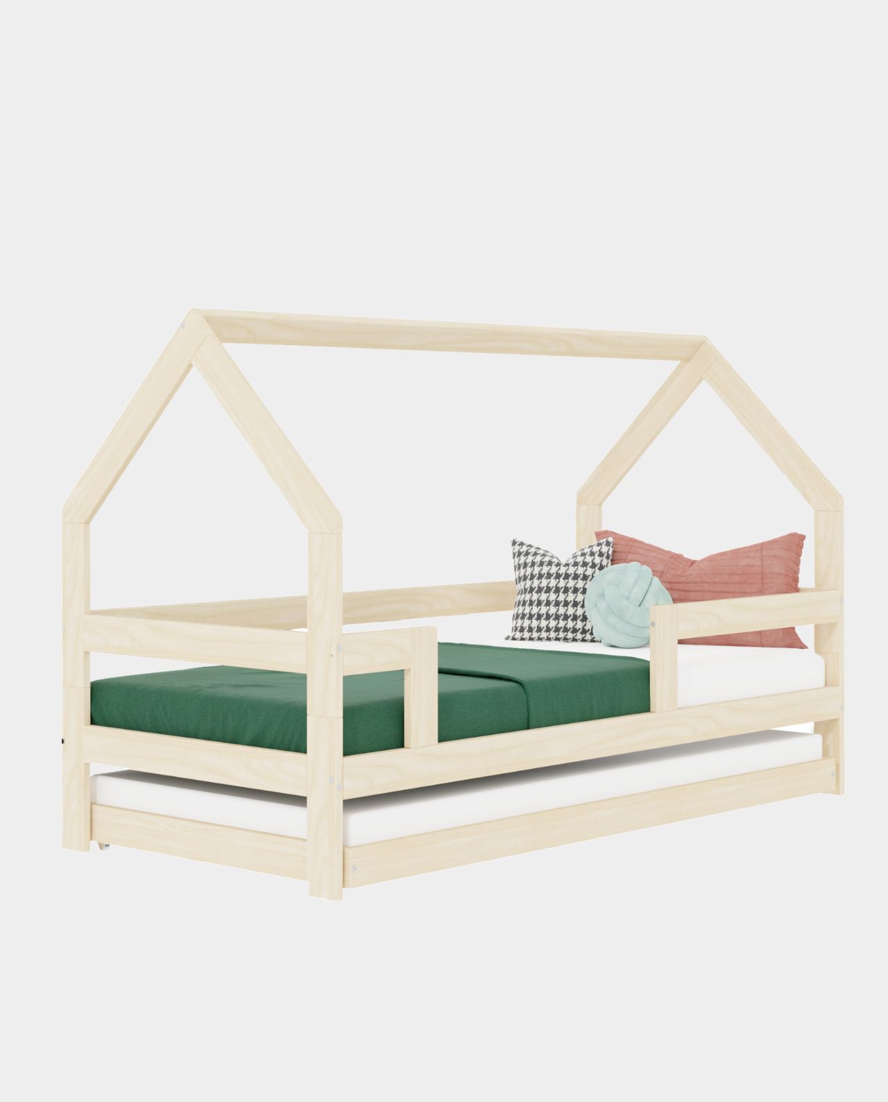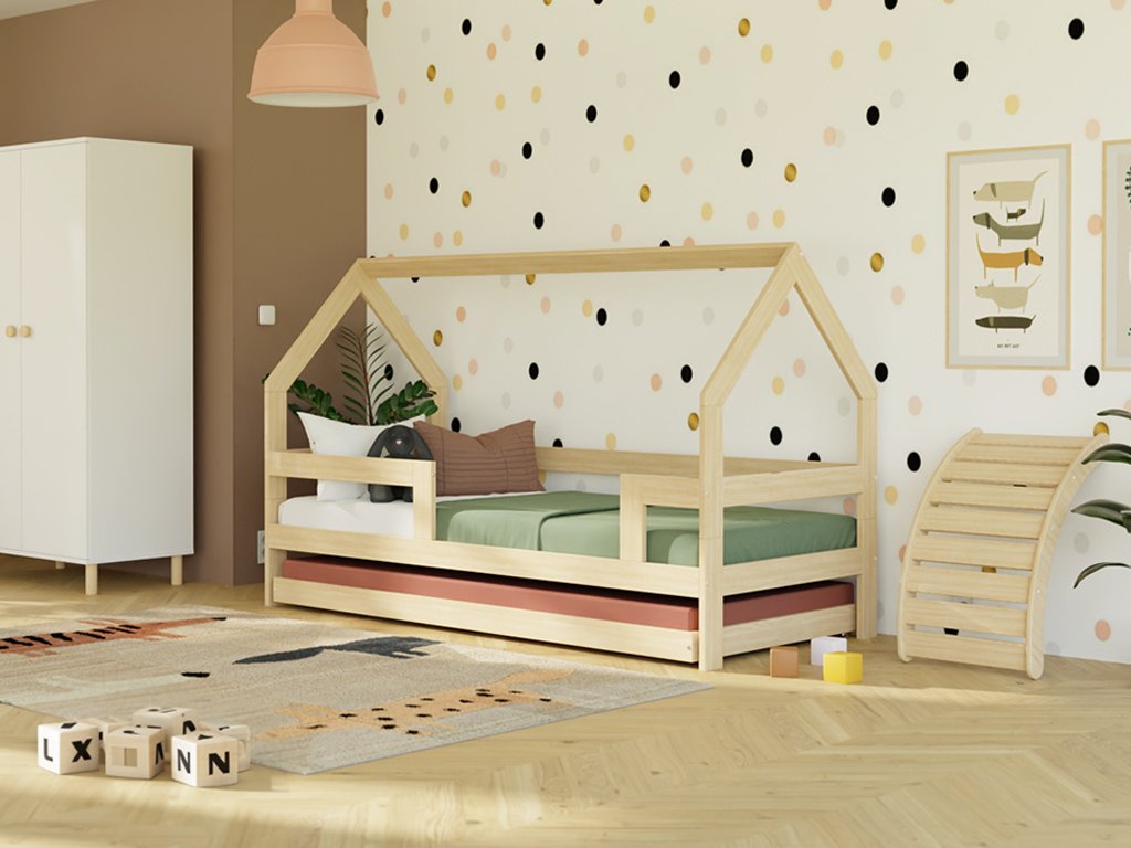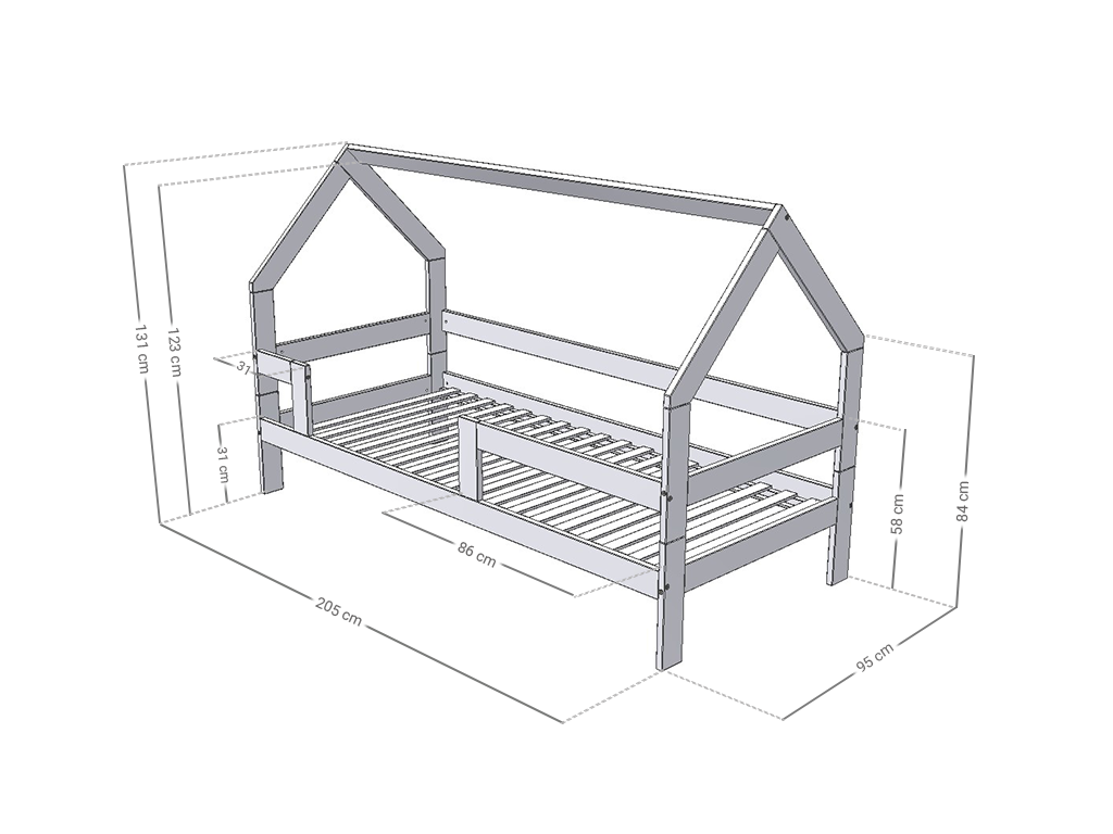 Dieses wundervolle Hausbett mit Rausfallschutz bietet deinem Kind alles was es braucht, um sich nachts richtig wohl zu fühlen. Das Kinderbett ist handgefertigt aus Fichtenholz wahlweise unbehandelt oder in Weiß mit ökologischer Farbe auf Wasserbasis. Der Lack ist auch für Allergiker geeignet. Die Variante Natur ist komplett natürlich und nicht mit Lack behandelt. Das Hausbett kann bis zu 120 kg tragen, so dass auch ein Elternteil zum Vorlesen der Gute-Nacht-Geschichte problemlos mit im Bett liegen kann.