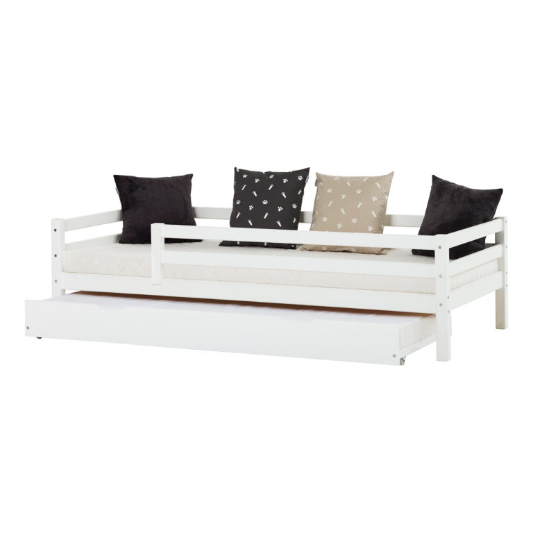Das ECO DREAM Kinderbett von Hoppekids in der Größe 90×200 cm mit Rausfallschutz wird aus massiver nordischer Kiefer gefertigt und ist mit dem Nordischen Umweltzeichen ausgezeichnet. Das Kinderbett in 90×200 cm ist wahlweise mit Schubladen, Ausziehbett oder kleiner Leiter erhältlich. Der Rausfallschutz kann jederzeit abmontiert werden. Somit kann das Kinderbett weiterhin genutzt werden, auch wenn dein Kind das Kleinkindalter verlassen hat und keinen Rausfallschutz mehr benötigt. Mit Stofftieren, schönen Bildern, einer Matratze, Kissen und mehr kann das Bett zusätzlich dekoriert werden. Ein Lattenrost ist bereits in der Lieferung inklusive. Eine Matratze ist nicht inklusive. Dekorationen wie z.B. Kissen, Bettwäsche sind nicht Teil der Lieferung.