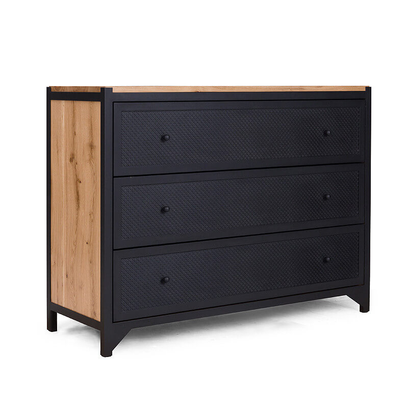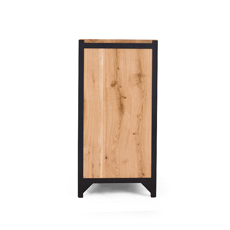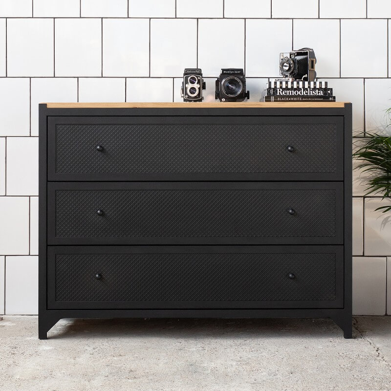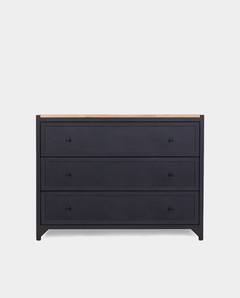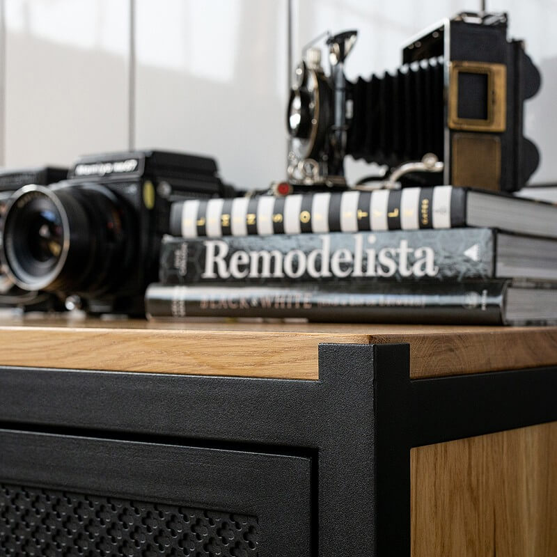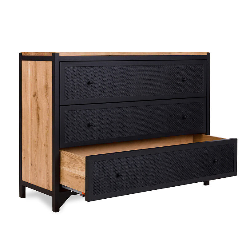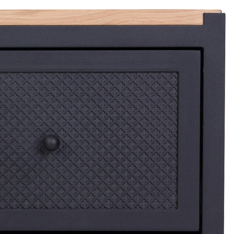 Die einzigartige Kommode CLOVER mit Schubladen wird aus Stahl und Eichenholz gefertigt. Die Kommode bietet mit den drei großen Schubladen viel Stauraum -egal ob im Wohnzimmer, Esszimmer oder Schlafzimmer. Das kleine Kleeblattmuster auf den Fronten der Schubladen wirkt sehr dekorativ. Die Kommode CLOVER wird in aufwändiger Handarbeit gefertigt, sowohl die Schubladen als auch Rückwand sind aus Eichenholz. Dank einer Soft-Close Funktion und einem Selbsteinzug schließen alle Schubladen selbstständig und geräuscharm. Es handelt sich hierbei um ein hochqualitatives und langlebiges Möbelstück.