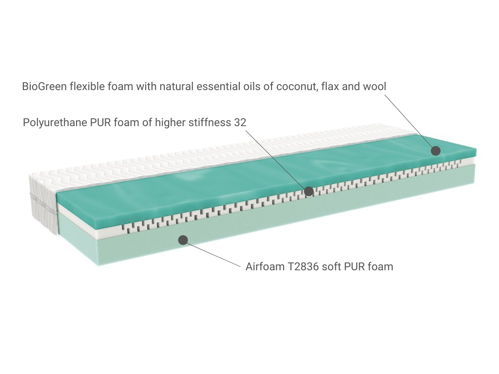 Ein guter und ausreichender Schlaf ist das ganze Leben lang wichtig. Die Schaummatratze COLUMBUS bietet maximalen Komfort im Kinderbett. Die untere Schicht besteht aus PUR-Monobloc T2836, in der Mitte ein fester PUR 32 und die obere Schicht besteht aus einem flexiblen Kräuterschaum BioGreen mit natürlichen ätherischen Ölen aus Kokosextrakten, Flachs und Wolle. Dank der verwendeten Materialien ist es auch für Allergiker geeignet und verfügt darüber hinaus über hervorragende Isolationseigenschaften.