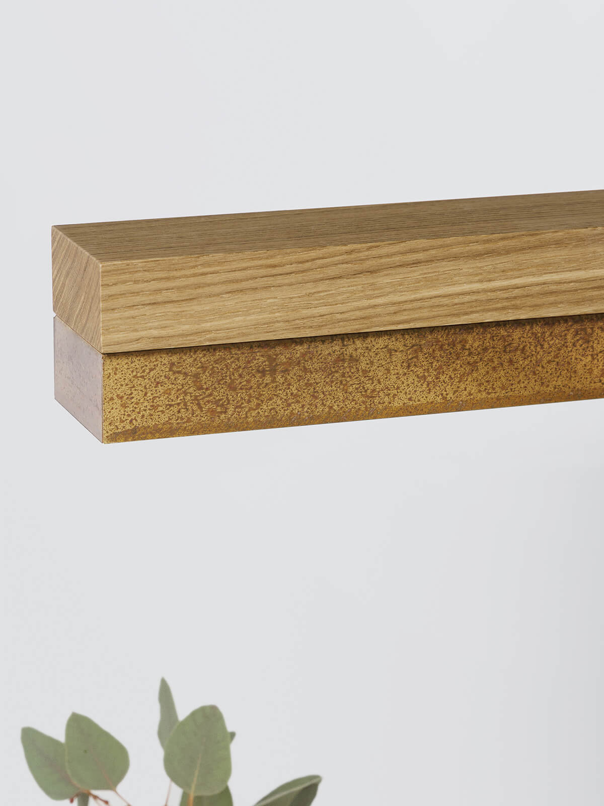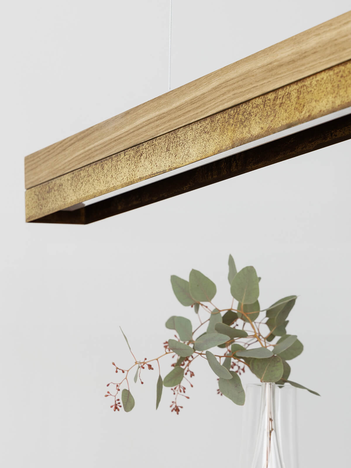 Die hochwertige Hängelampe C-OXI ist eine Kombi aus edlem Eichenholz und oxidiertem Messing, was die Pendelleuchte zu einer zeitlosen und eleganten Designerleuchte macht. Die unterschiedlichen Materialien der Lampenschirme (unterer Teil der Leuchte) lassen sich individuell kombinieren und können jederzeit gewechselt werden.