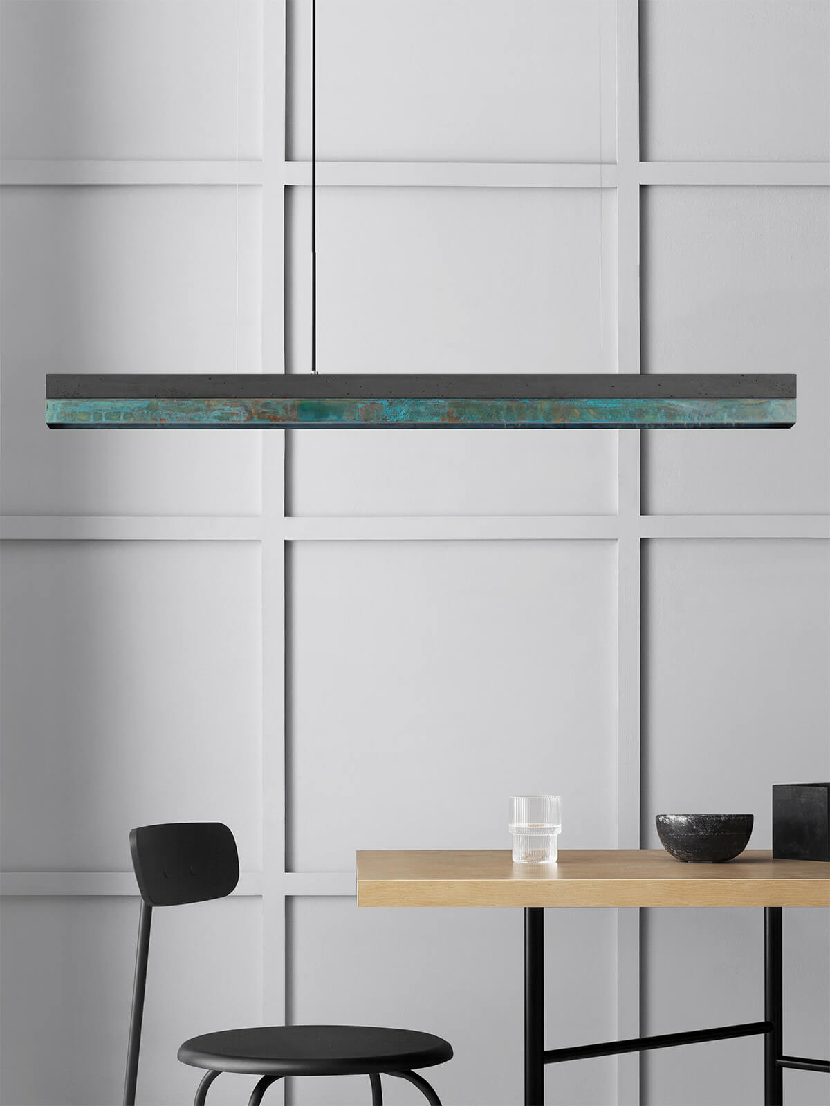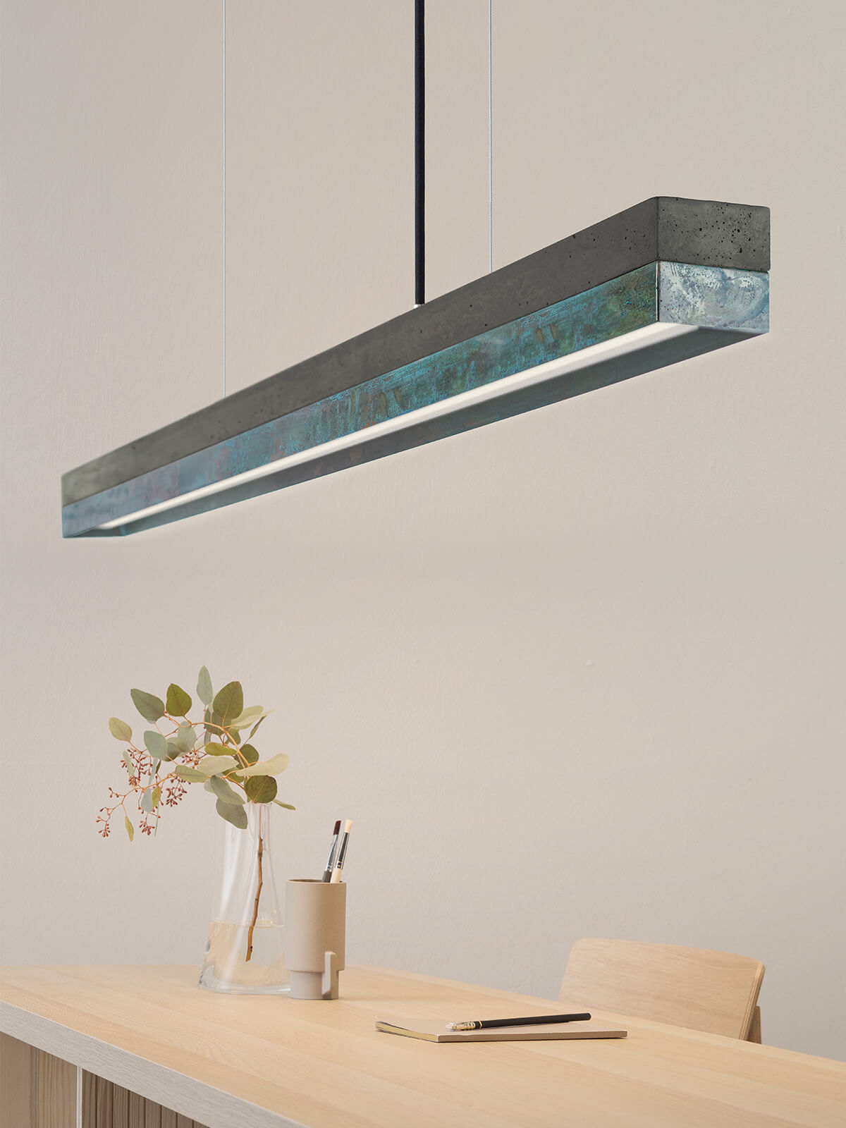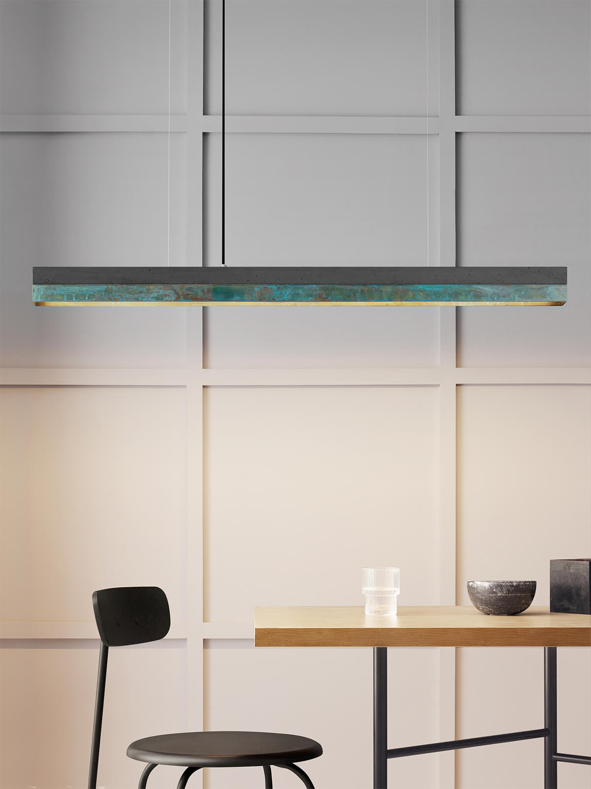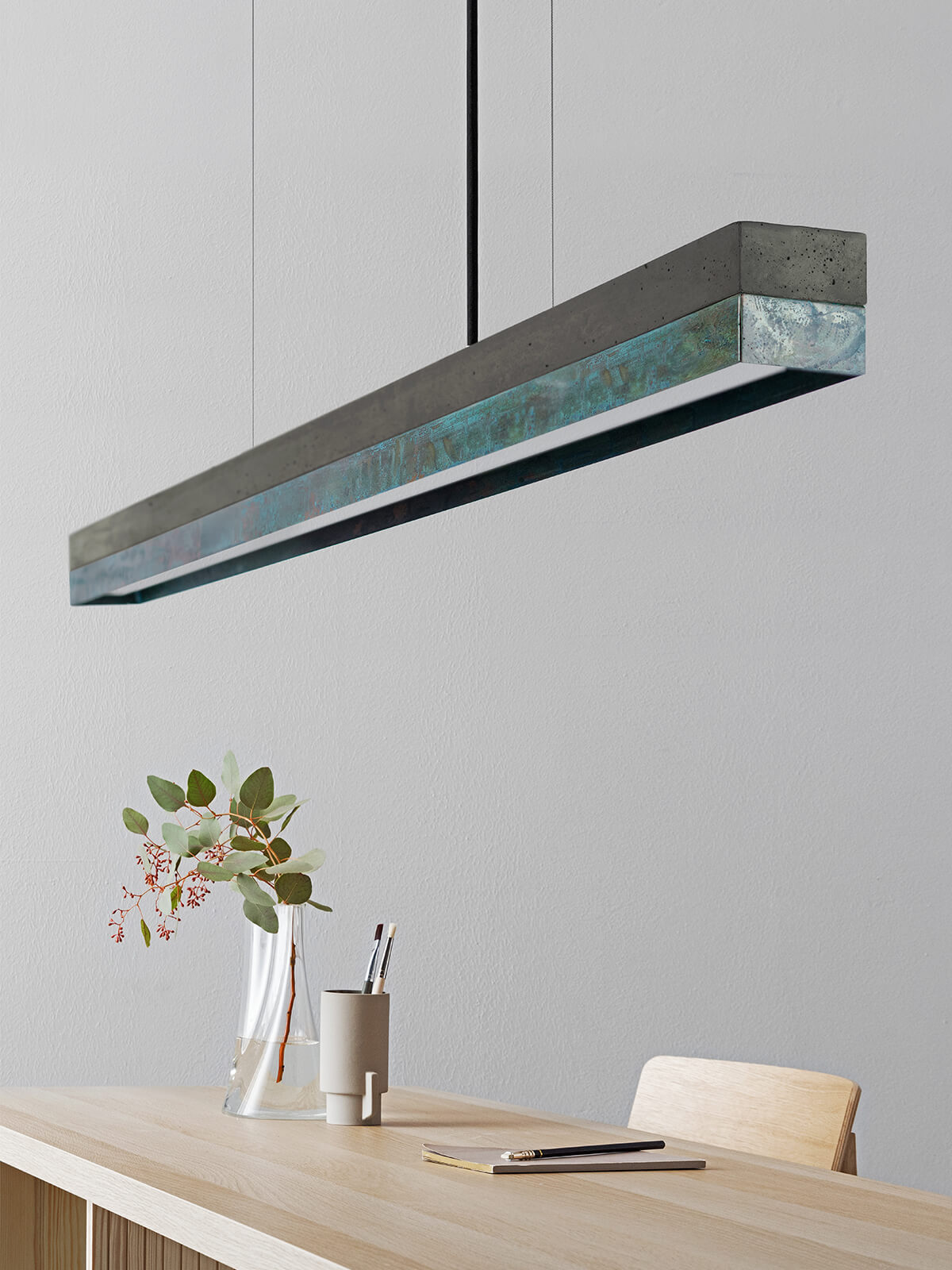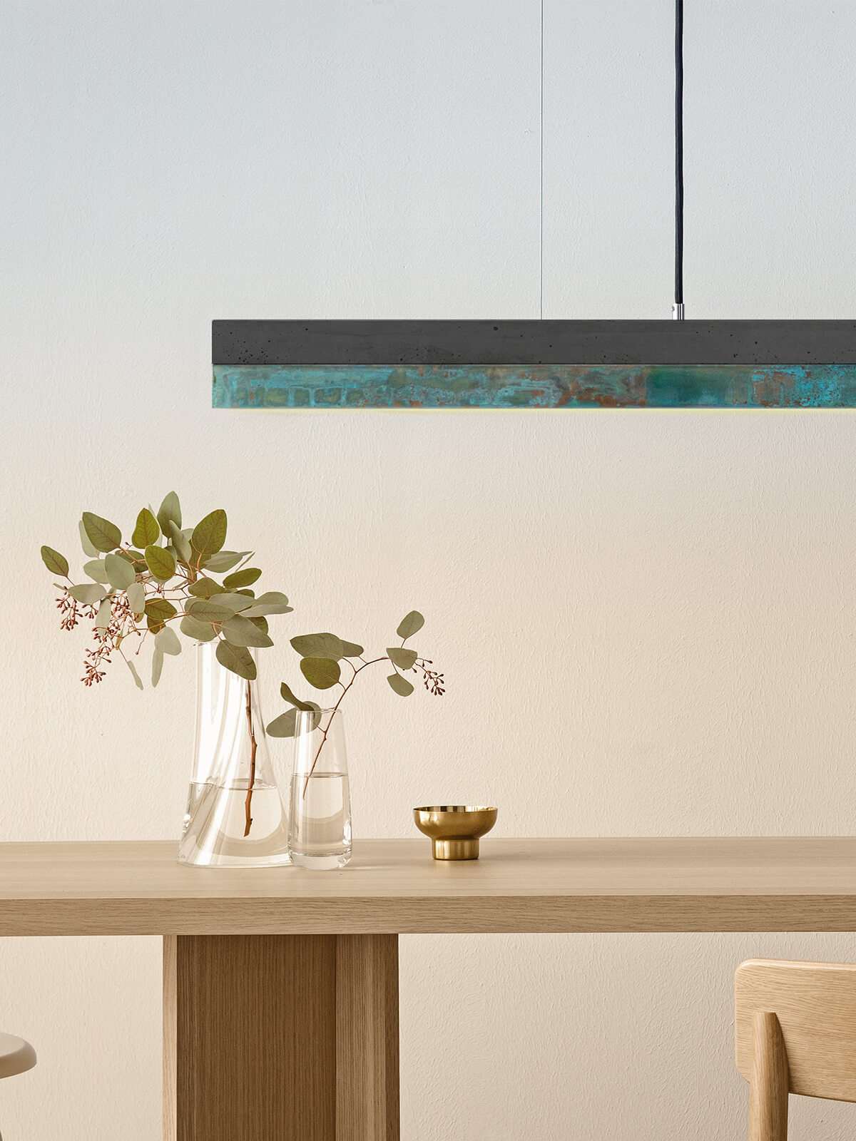 Die hochwertige Hängelampe C-OXICO ist eine Kombi aus dunklem Beton und oxidiertem Kupfer, was die Pendelleuchte zu einer einzigartigen Designerleuchte macht. Die unterschiedlichen Materialien der Lampenschirme (unterer Teil der Leuchte) lassen sich individuell kombinieren und können jederzeit gewechselt werden.
