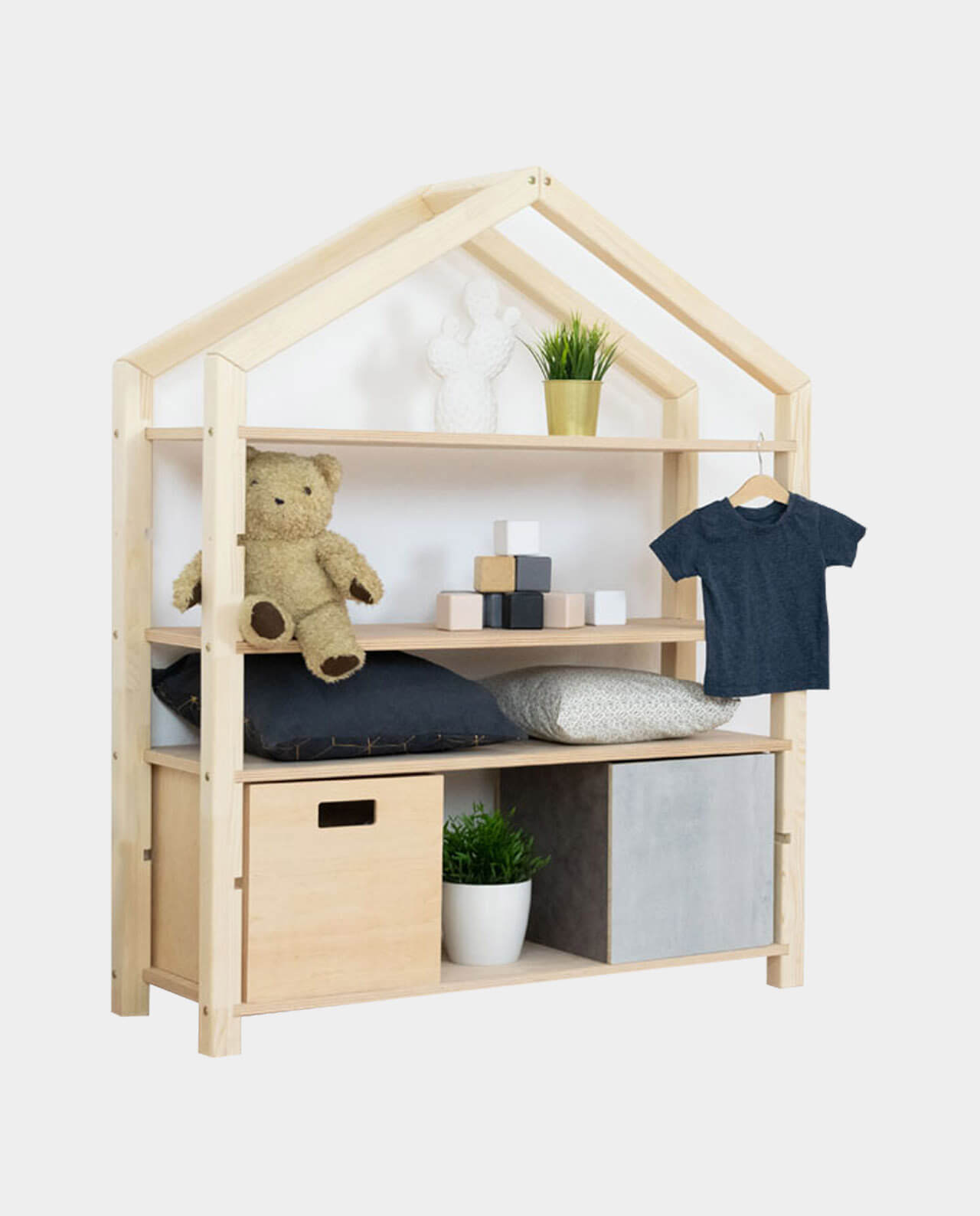 Das Regal POLLY dient als kinderfreundliche Aufbewahrungsmöglichkeit für Bücher, Spielzeug und all das, was im Kinderzimmer einen festen Platz benötigt. Das hausförmige Regal mit Dach ist 111cm Lang, 39cm tief und 137cm hoch. Es ist aus hochwertigem Massivholz handgefertigt. Wähle die Farbvariante, die am besten ins Kinderzimmer passt. Du kannst selbst entscheiden, auf welchen Ebenen die 4 Regalböden angebracht werden.