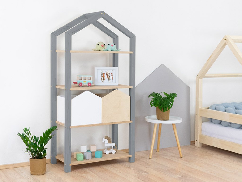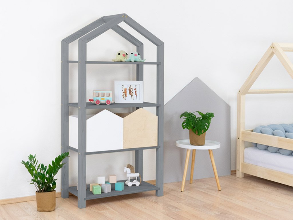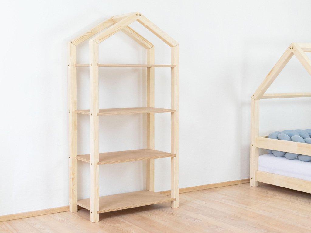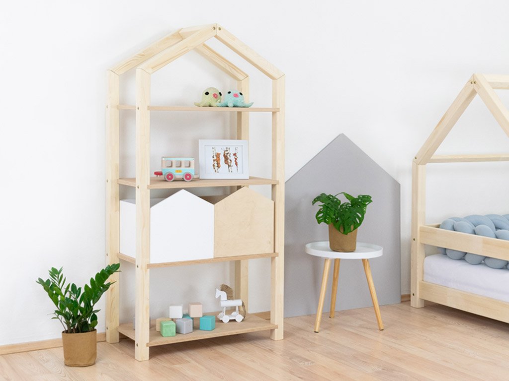 Das Regal TALLY dient als kinderfreundliche Aufbewahrungsmöglichkeit für Bücher, Spielzeug und all das, was im Kinderzimmer einen festen Platz benötigt. Das hausförmige Regal mit Dach ist 77cm Lang, 39cm tief und 152cm hoch. Es ist aus hochwertigem Massivholz handgefertigt. Wähle die Farbvariante, die am besten ins Kinderzimmer passt. Bei der Variante „Natur“ handelt es sich um unbehandeltes Holz. Alle anderen Varianten sind mit 100% natürlichen, ökologischen, antiallergenen Farben lackiert. Die Holzmaserung scheint noch durch die Farbe hindurch und gibt dem Regal einen natürlichen Charakter.