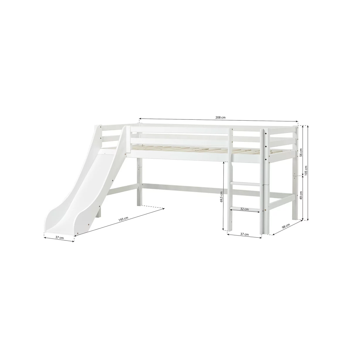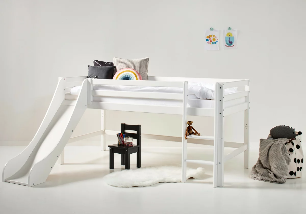 Das ECO DREAM Rutschbett von Hoppekids in der Größen 90×200 cm mit gerader Leiter und Rutsche ist ein modernes Halbhochbett. Es wird aus massiver nordischer Kiefer gefertigt und ist mit dem Nordischen Umweltzeichen ausgezeichnet. Die Höhe von 105 cm ist großartig, weil das Kind ins Bett klettern muss – und damit die Motorik trainiert wird. Das Rutschbett ist wahlweise mit einem Vorhang erhältlich, der ans Bett gehangen wird und somit eine gemütliche kleine Höhle bildet. Mit Lichterketten, schönen Bildern, einer Matratze, Kissen und mehr kann das Bett zusätzlich dekoriert werden. Die Rutsche verwandelt das Bett in ein lustiges Spielbett, welches das Aufstehen am Morgen wesentlich erleichtert! Sowohl die Rutsche als auch die Leiter können sowohl auf der linken als auch auf der rechten Seite des Bettes angebracht werden. Die Höhe unter dem Bett beträgt 69cm. Ein Lattenrost ist bereits in der Lieferung inklusive. Eine Matratze ist nicht inklusive. Dekorationen wie z.B. Kissen sind nicht Teil der Lieferung.