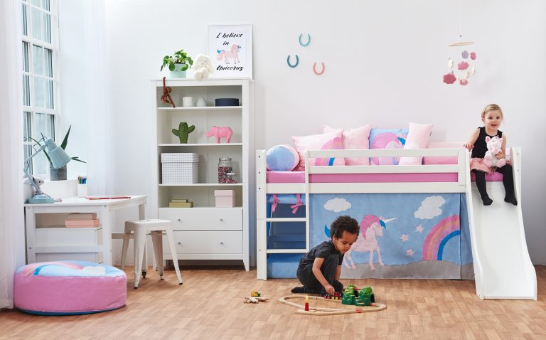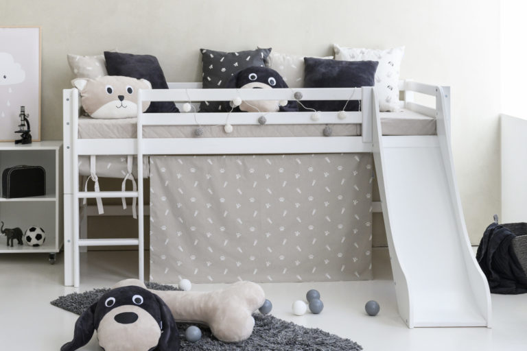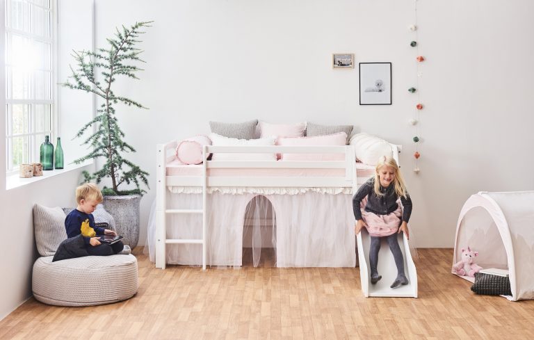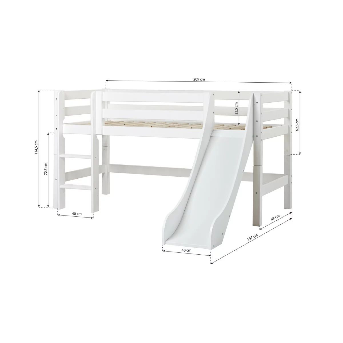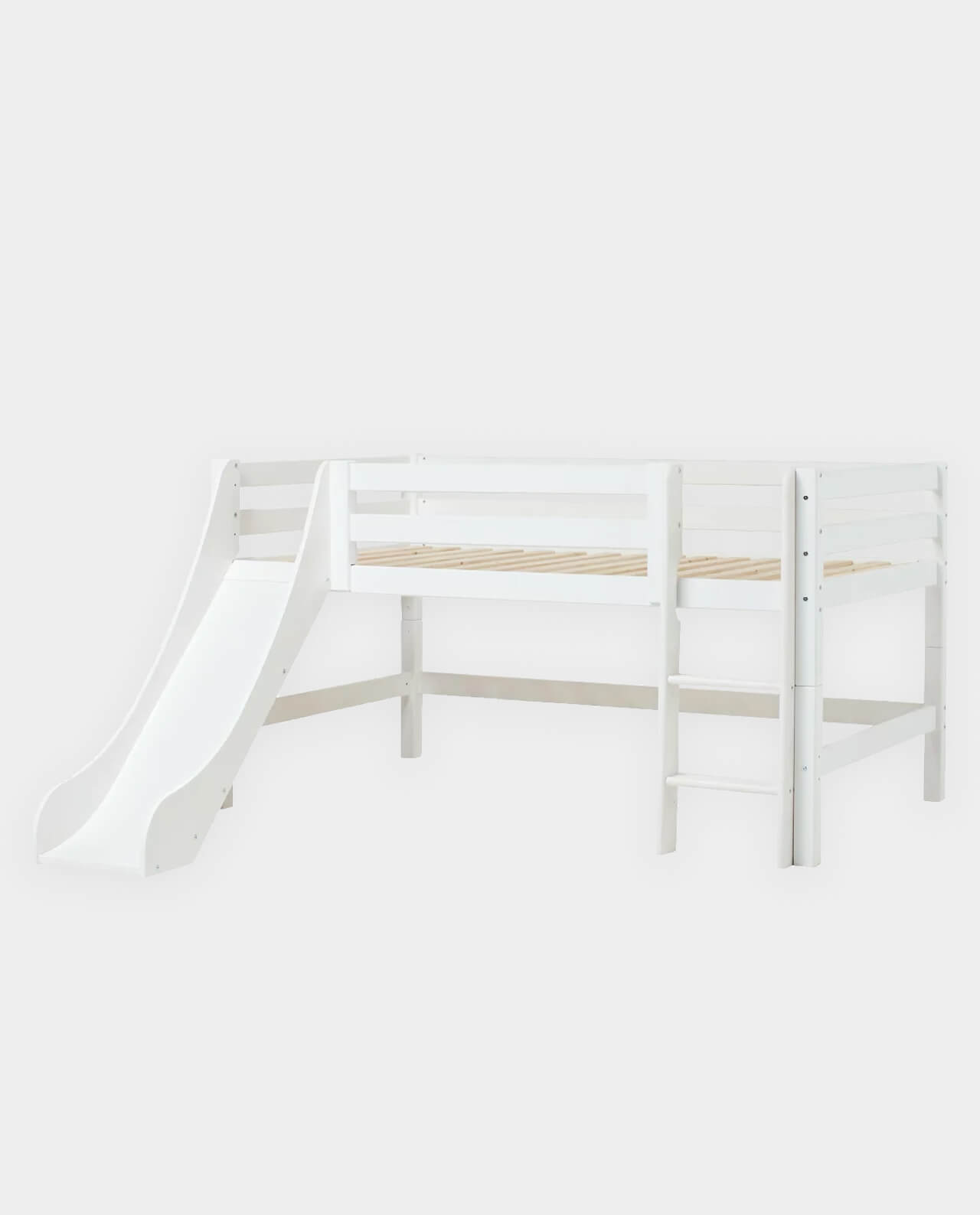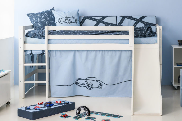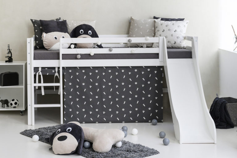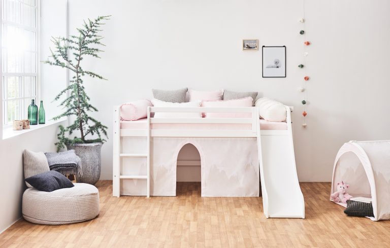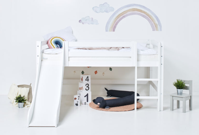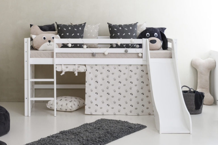 Das ECO LUXURY Rutschbett von Hoppekids in der Größen 90×200 cm oder 120×200 cm mit gerader Leiter und Rutsche ist ein modernes Halbhochbett. Es wird aus massiver nordischer Kiefer gefertigt und ist mit dem Nordischen Umweltzeichen ausgezeichnet. Das Rutschbett in 90×200 cm ist wahlweise mit einem Vorhang erhältlich, der ans Bett gehangen wird und somit eine gemütliche kleine Höhle bildet. Mit Lichterketten, schönen Bildern, einer Matratze, Kissen und mehr kann das Bett zusätzlich dekoriert werden. Die Rutsche verwandelt das Bett in ein lustiges Spielbett, welches das Aufstehen am Morgen wesentlich erleichtert! Sowohl die Rutsche als auch die Leiter können sowohl auf der linken als auch auf der rechten Seite des Bettes angebracht werden. Das Rutschbett ECO LUXURY ist ein flexibles und langlebiges Halbhochbett mit höchstem Komfort und größtmöglichem Augenmerk auf die Sicherheit. Dazu kommt die Stabilität und die lange Haltbarkeit sowie die breite Palette an Modulen und Zubehör. Das Bett ist modular umbaubar und kann beispielsweise in ein Standard Kinderbett verwandelt werden. Der Rausfallschutz kann ebenfalls abmontiert werden. So wächst das Bett mit den Anforderungen und Bedürfnissen des Kindes und verlängern den Lebenszyklus des Produktes. Die Höhe unter dem Bett beträgt 72 cm. Ein Lattenrost ist bereits in der Lieferung inklusive. Eine Matratze ist nicht inklusive. Dekorationen wie z.B. Kissen sind nicht Teil der Lieferung.
