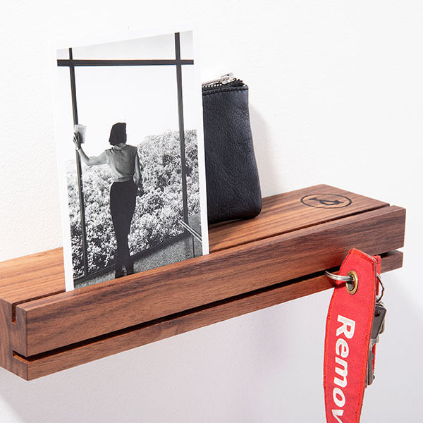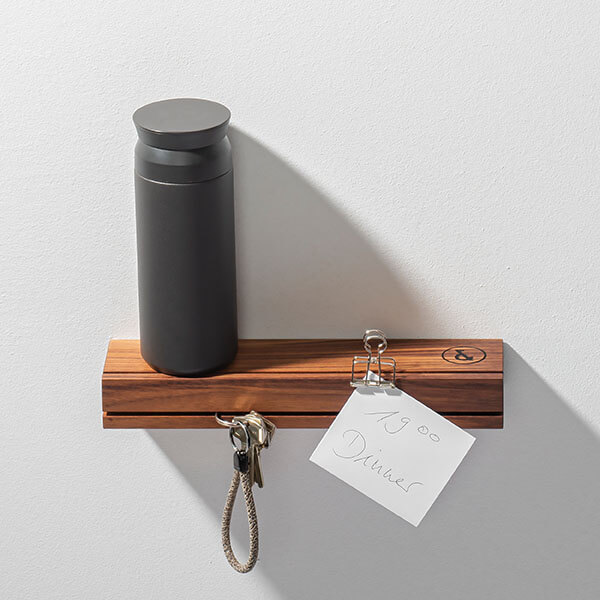 Schlüssel, Portemonnaie, Handy – das Wichtigste für den Gang aus dem Haus findet mit dem Schlüsselbrett NUSSBAUM 01 von weld & co seinen Platz. In den Front-Schlitz der kleinen Ablage können Schlüssel und Schlüsselringe gesteckt werden, in der Fräsung an der Oberseite des Schlüsselbretts halten Postkarten, wichtige Briefe, Tickets etc. Außerdem lassen sich mithilfe eines Briefklemmers in der Fräsung Notizen fixieren. Auch Sonnenbrille, Kaffeebecher und Wasserflasche für unterwegs und alle kleinen Gegenstände, die nicht zuhause vergessen werden sollen, können auf dem Schlüsselboard bereitliegen. So wird das Schlüsselbrett zum handlichen „Multifunktionswandregal“ für Eingangsbereich und Flur.