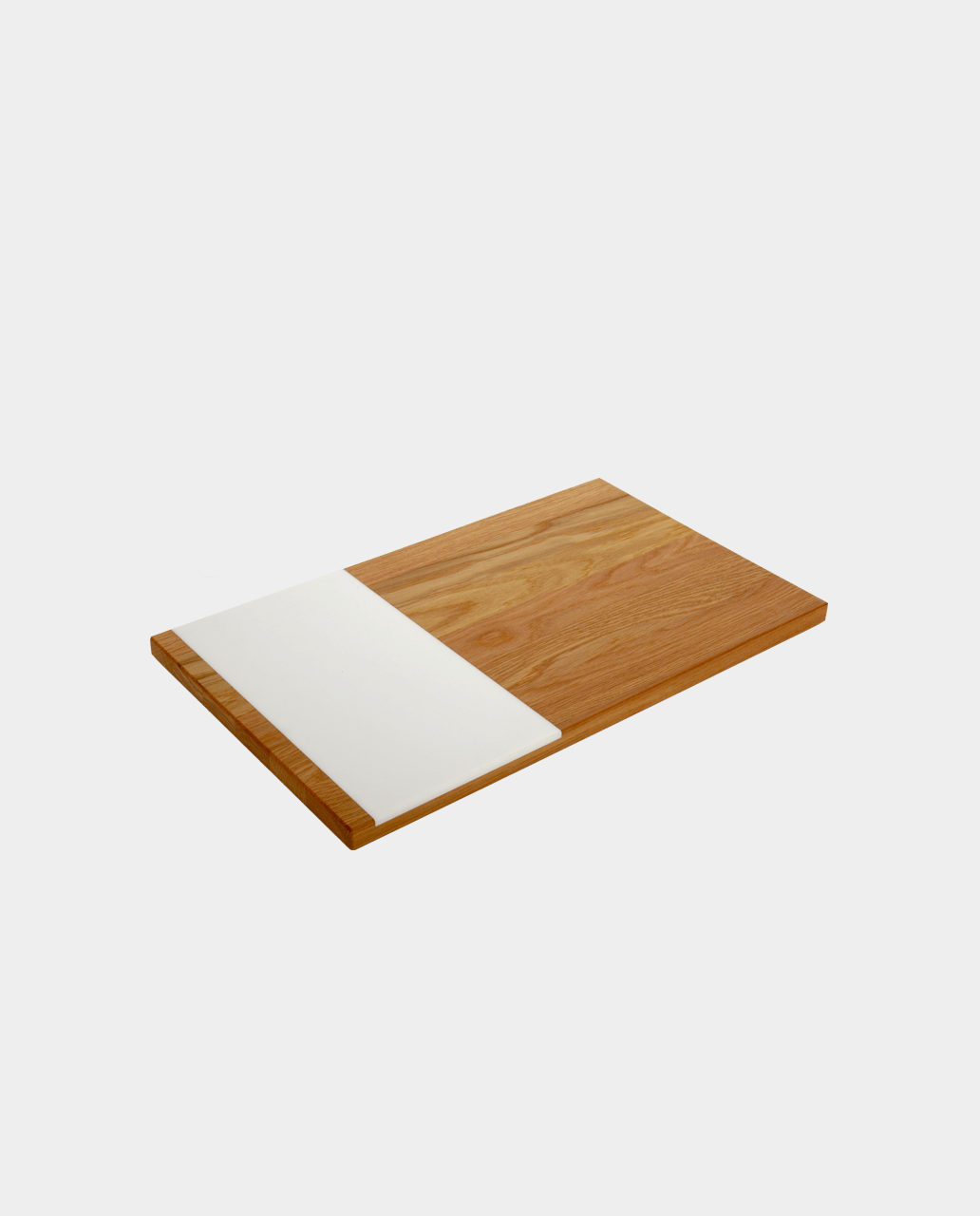 Schneidebrett und Servierplatte in einem. Hergestellt aus geöltem Eichenholz und robustem Acrylstein.