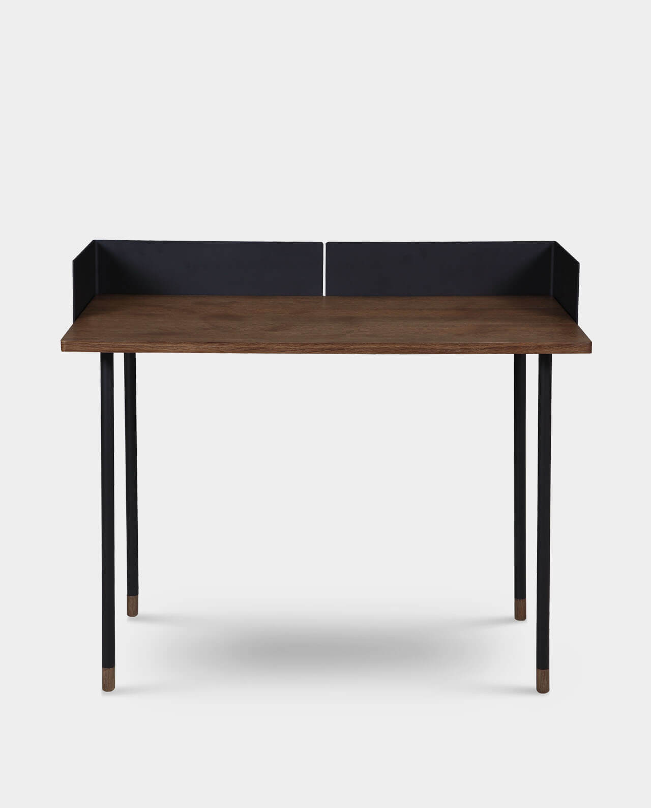 Der Schreibtisch BUENA mit einer Holzplatte aus dunkler Eiche (MDF-Platte mit Massivholzfunier), pulverbeschichteten Beinen und schwarzem Metallrahmen besticht durch sein minimalistisches Design und passt perfekt in jeden Raum. Die schwarzen Metallseiten im Spaltdesign und die Sechskantschrauben unterstreichen den cleanen Charakter. BUENA spart Platz und bietet gleichzeitig genügend Schreibfläche zum Arbeiten und um alle wichtigen Dokumente im Blick zu behalten. Er ist ideal für das Arbeitszimmer, Wohnzimmer oder in einer kleinen Nische im Schlafzimmer und verleiht deinem Zuhause das gewisse Etwas.