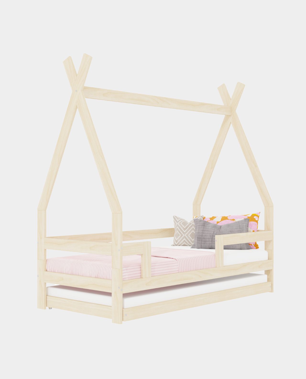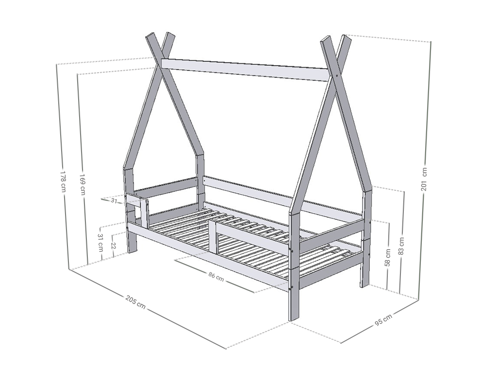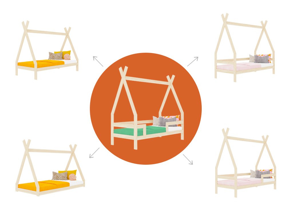 Dieses wundervolle Tipi Bett mit Rausfallschutz bietet deinem Kind alles was es braucht, um sich nachts richtig wohl zu fühlen. Das Kinderbett ist handgefertigt aus Fichtenholz wahlweise unbehandelt oder in Weiß mit ökologischer Farbe auf Wasserbasis. Der Lack ist auch für Allergiker geeignet. Die Variante Natur ist komplett natürlich und nicht mit Lack behandelt. Das Tipi Bett kann bis zu 120 kg tragen, so dass auch ein Elternteil zum Vorlesen der Gute-Nacht-Geschichte problemlos mit im Bett liegen kann.