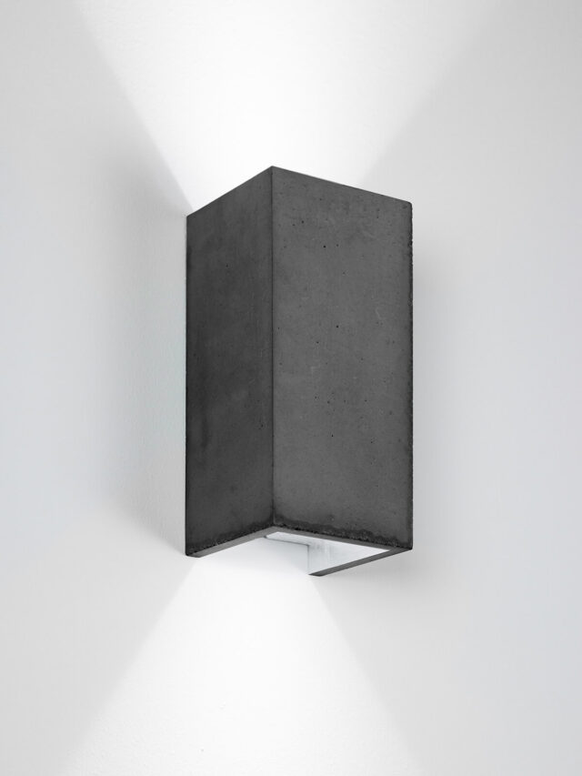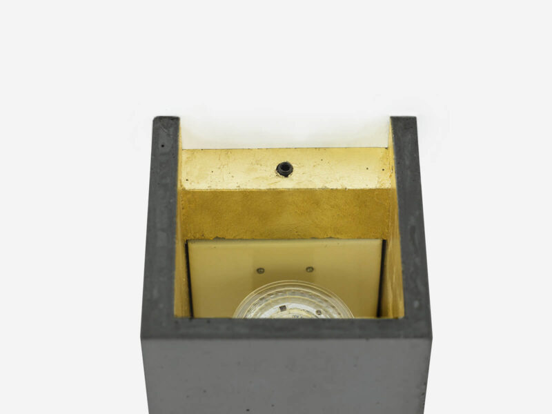 Die rechteckige Wandlampe B8 wird aus dunkelgrauem Beton gegossen. Sie vereint edles Gold, Silber oder Kupfer mit rauem Beton zu einer zeitlosen und stilvollen Designerleuchte. Durch die veredelte Innenseite gibt sie ein warmes Licht ab.