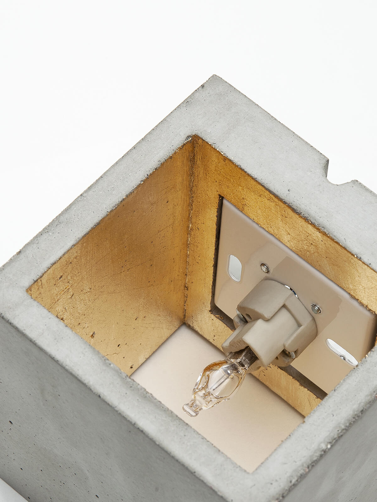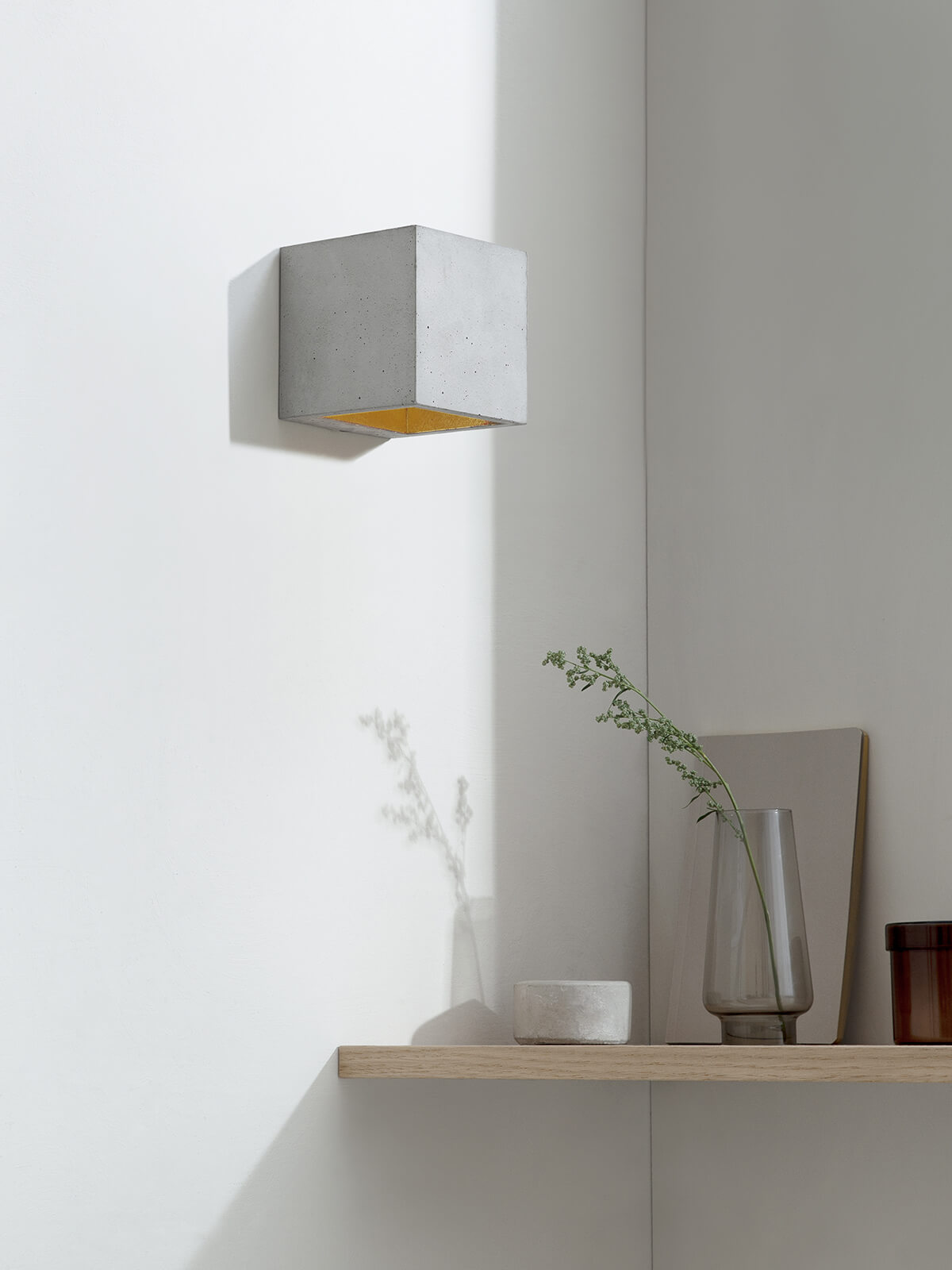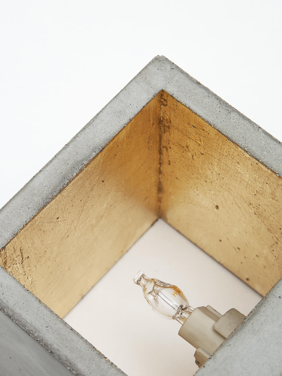 Die quadratische Wandlampe B9 wird aus hellgrauem Beton gegossen. Sie vereint edles Gold, Silber oder Kupfer mit rauem Beton zu einer zeitlosen und stilvollen Designerleuchte. Durch die veredelte Innenseite gibt sie ein warmes Licht ab.