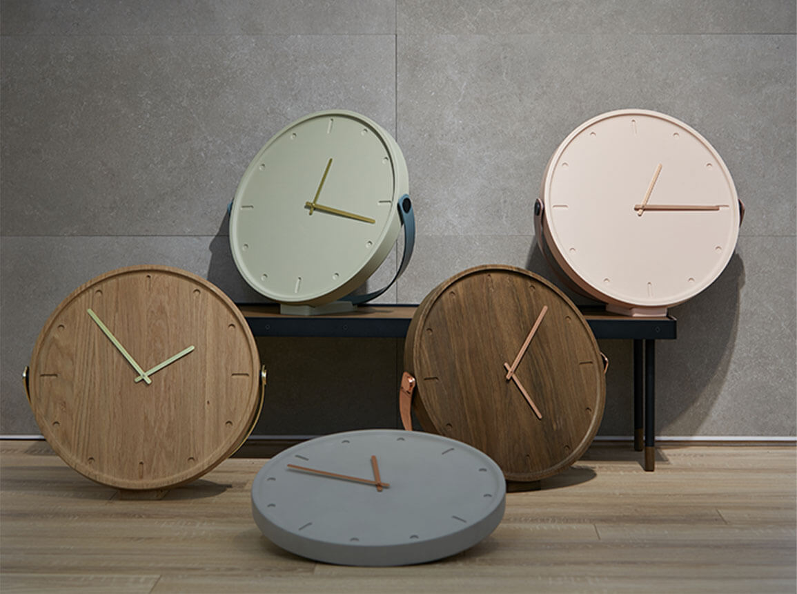Zeit und Raum neu definieren. Die Designuhr CLARA wurde mit gummierter Farbe in Pastellrosé beschichtet, am Rand beschnitten und mit einem Kupferzeiger komplementiert. CLARA konzentriert sich auf das Wesentliche: die Zeit. Das klare Design spricht für sich und beweist, dass die Einfachheit das Besondere ausmacht. Die Uhr wird mit farblich passenden Sockel geliefert, kann aber auch an der Wand aufgehängt werden. Zwei Positionslöcher für Haken sind vorhanden. Der Ring ist beweglich. Der Durchmesser beträgt 44cm. Die Tiefe liegt bei 4cm. CLARA ist absolut lautlos und eignet sich daher auch hervorragend fürs Büro oder Home Office.